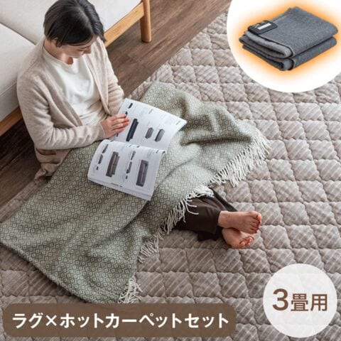 ラグ+ホットカーペット2点セット 3畳用 ホットカーペットセット 防菌 防臭 防ダニ 軽量 ラグ 床暖房カーペット 電気マット 正方形 オールシーズン 絨毯 ストライプ フランネル 99900119〔ウォームグレー〕【予約】12月下旬※12/31までに出荷予定