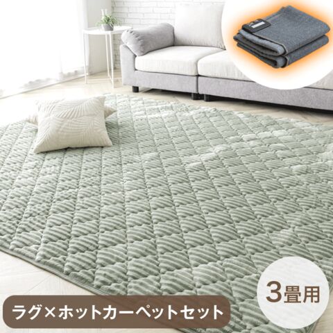 ラグ+ホットカーペット2点セット 3畳用 ホットカーペットセット 防菌 防臭 防ダニ 軽量 ラグ 床暖房カーペット 電気マット 正方形 オールシーズン 絨毯 ストライプ フランネル 99900119〔セージグリーン〕