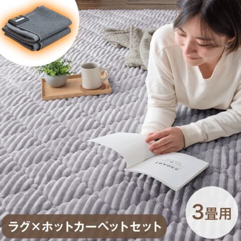 【即納】 ラグ+ホットカーペット2点セット 3畳用 ホットカーペットセット 防菌 防臭 防ダニ 軽量 ラグ 床暖房カーペット 電気マット 正方形 オールシーズン 絨毯 ストライプ フランネル 99900119〔ラベンダーグレー〕
