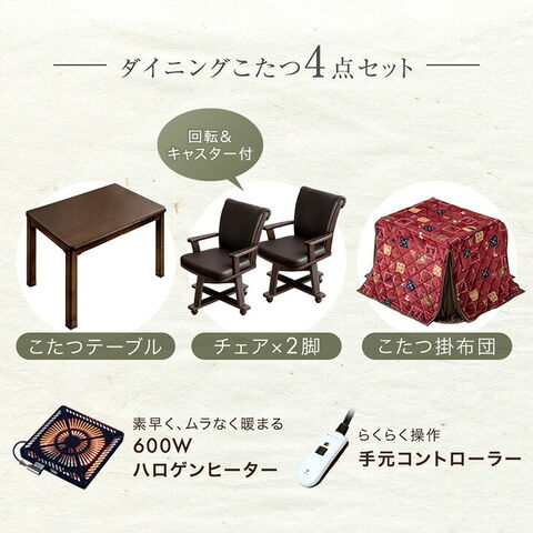 | スタッフどみーのおすすめポイント | ・こたつ本体+チェア2脚+掛布団の4点セット 【こたつ本体】 ・ぬくもり感じる天然木突板天板 ・お好みに合わせて高さ4段階調節可能 ・操作しやすい手元コントローラー ・すぐに温まる600Wハロゲンヒーター ・ヒーターは安心の一年保証 【チェア】 ・立ち座りが楽な回転式&キャスター付き ・こたつ内の暖気を逃がさない仕切り板付き 【こたつ布団】 ・肌さわりの良い フランネル生地 ・可愛いギャッベ柄 |