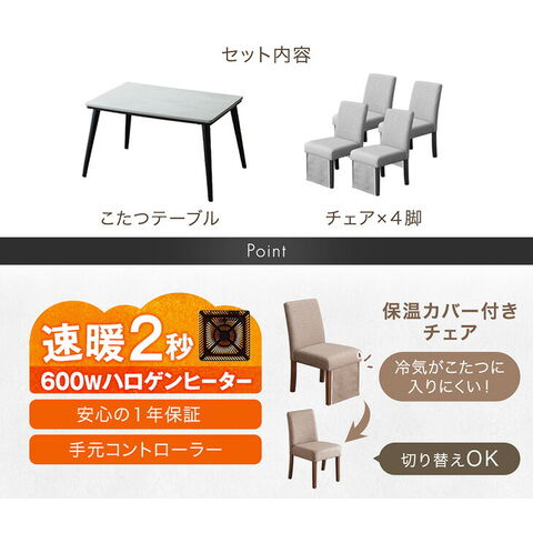 【こたつテーブル】 ・選べる2種類の天板 ┗温かみのあるウォールナット ┗モダンなストーンホワイト ・キズや汚れに強いメラミン天板 ・速暖&長寿命のハロゲンヒーターこたつ ・こたつ内をムラなく暖めるモーターファン ・操作しやすい手元コントローラー ・確かな品質、メトロ工業製ヒーター ・ヒーターは安心の一年保証 【チェア】 ・座り心地の良いクッション座面/背もたれ ・オールシーズン快適 ファブリック生地 ・ダイニングこたつ対応 保温カバー付き ・温もり感じる天然木脚 |