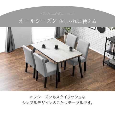 【こたつテーブル】 ・選べる2種類の天板 ┗温かみのあるウォールナット ┗モダンなストーンホワイト ・キズや汚れに強いメラミン天板 ・速暖&長寿命のハロゲンヒーターこたつ ・こたつ内をムラなく暖めるモーターファン ・操作しやすい手元コントローラー ・確かな品質、メトロ工業製ヒーター ・ヒーターは安心の一年保証 【チェア】 ・座り心地の良いクッション座面/背もたれ ・オールシーズン快適 ファブリック生地 ・ダイニングこたつ対応 保温カバー付き ・温もり感じる天然木脚 【掛け布団】 ・手触りが良く暖かいフランネル掛布団 ・リモコンなどを収納できるポケット付き |