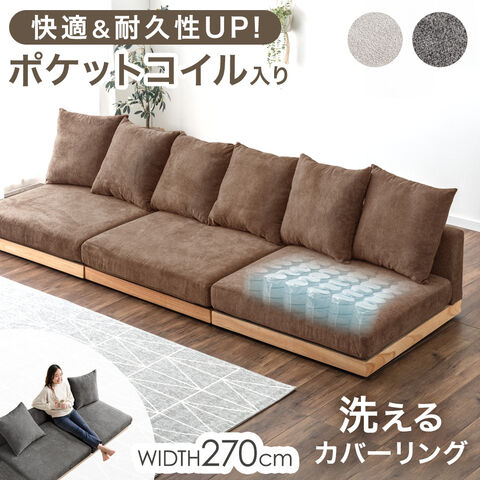 【即納】 快適&高耐久 ポケットコイル フロアソファ ワイド 幅270cm 洗える カバーリング 4人掛け 3人掛け ソファ ローソファフロアソファ ソファベッド 木製フレーム おしゃれ 北欧 99900274〔モカブラウン〕