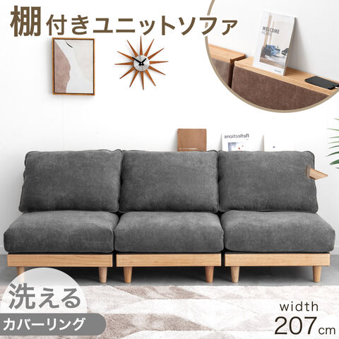 【即納】 棚付き ユニットソファ 幅207cm 洗える カバーリング 3人掛け ソファ 組み合わせ ウッドフレーム ローソファ フロアソファ 二人掛け 棚付き ファブリック 木枠 北欧 おしゃれ 99900278〔チャコールグレー〕