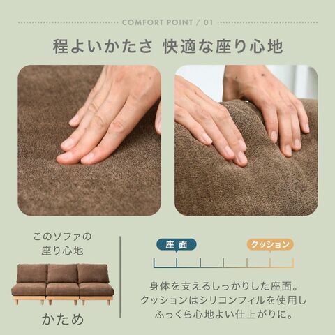| 備考 | 【組立品】 ※配送は全て宅配便(1人)での玄関渡しとなります。大型商品や重量商品、エレベーターの無い2階以上にお住まいのお客様は、玄関口までの搬入をお手伝いをお願いしております事をご了承ください。 ※クッションは圧縮した状態でお届けするため、復元にお時間がかかる場合がございます。 ※本ソファのカバーはご家庭でお洗濯可能です。製品についている洗濯表示には「ドライクリーニングのみ可」の記載がありますが、30℃を限度に弱~標準モードであればご自宅の洗濯機でお手入れできます。 ※座面にはウレタンを内蔵しております。ウレタンの感温性(ウレタンは温度が高くなると柔らかくなり、低くなると硬さが高くなる性質)により開封直後は座面の硬さの差異を感じる場合があります。2個以上を並べて使用する場合、特に違いを感じやすくなりますが、同じ環境に配置すると徐々に改善していきます。予めご了承ください。 ※商品は柔らかい素材で作られてますので、測り方によって多少サイズに誤差が生じる場合がございます。予めご了承下さい。 ※こちらの商品は2025年2月10日に、カラー名を「ダークブラウン」から「モカブラウン」に変更しました。 |