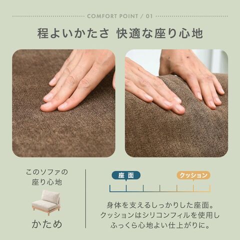 | 素材 | 張地:ポリエステル 座面中材:ウレタンフォーム クッション中材:シリコンフィル 脚部:天然木(ラバーウッド) 土台:天然木(ラバーウッド)、Sバネ、ワイヤー |
