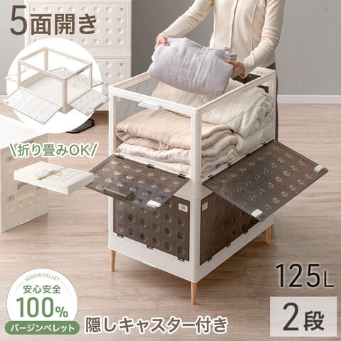【即納】 5面開き 収納ボックス 2段 125L お掃除ロボ対応 天然木脚&キャスター付き 折り畳み 積み重ね 大容量 収納 押入れ収納 ふた付き 布団 衣装ケース チェスト 99900660〔クリアブラック〕