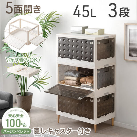 【即納】 5面開き 収納ボックス 3段 45L お掃除ロボ対応 天然木脚&キャスター付き 折り畳み 積み重ね 大容量 収納 押入れ収納 ふた付き 布団 衣装ケース チェスト 99900780〔クリアブラック〕