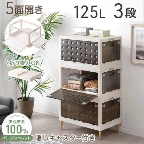 【即納】 5面開き 収納ボックス 3段 125L お掃除ロボ対応 天然木脚&キャスター付き 折り畳み 積み重ね 大容量 収納 押入れ収納 ふた付き 布団 衣装ケース チェスト 99900810〔クリアブラック〕