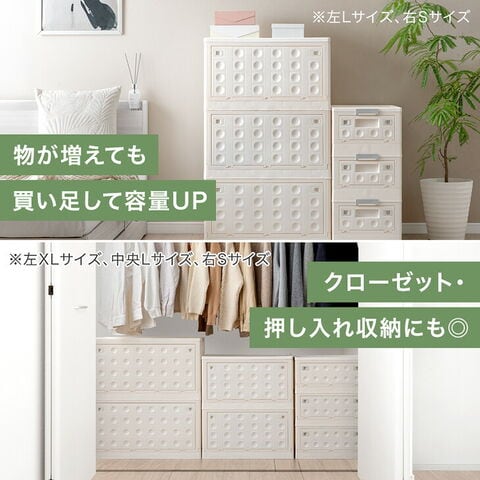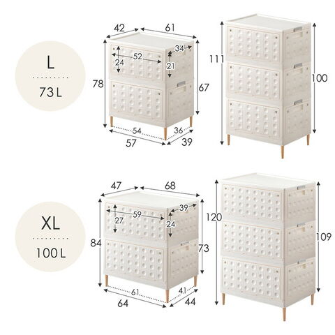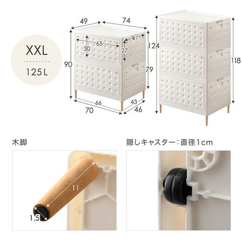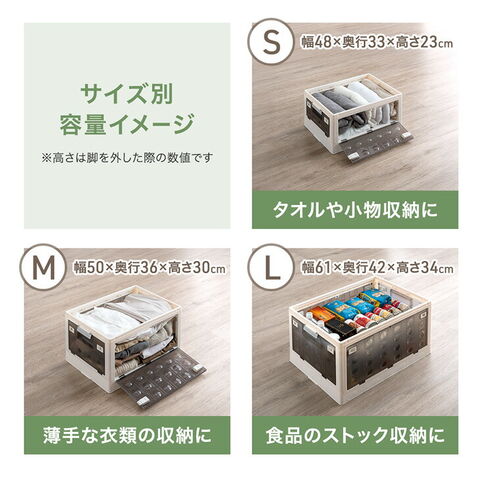 | サイズ | S:幅48x奥行33x高さ23/34cm(30L) M:幅50x奥行36x高さ30/41cm(45L) L:幅61x奥行42x高さ34/45cm(73L) XL:幅68x奥行47x高さ37/48cm(100L) XXL:幅74x奥行49x高さ40/51cm(125L) ※1個あたり |