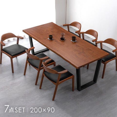 お掃除ロボット対応 ダイニングテーブルセット 6人掛け 天然木 7点セット 200cm テーブル 玄関渡し 99901157〔ブラウン(PVC座面:ブラック)〕【予約】1月中旬※1/20までに出荷予定