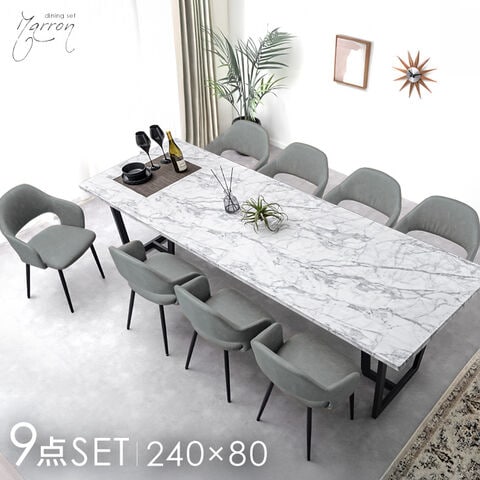 幅240cm 石目調 ダイニングセット 8人掛け 9点 長方形 テーブル チェア 大人数 玄関渡し 【超大型】99901183〔テーブル:ブラウニーブラック/チェア:アッシュグレー(レザー)〕