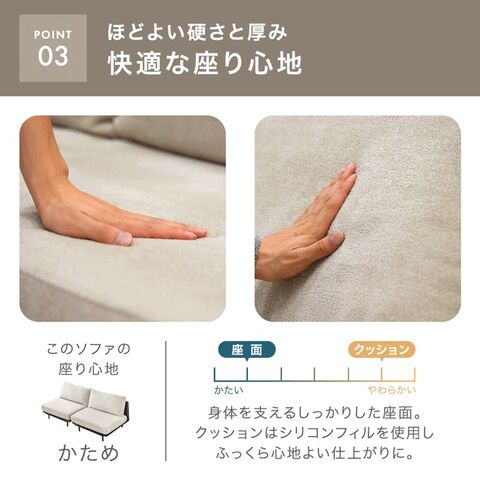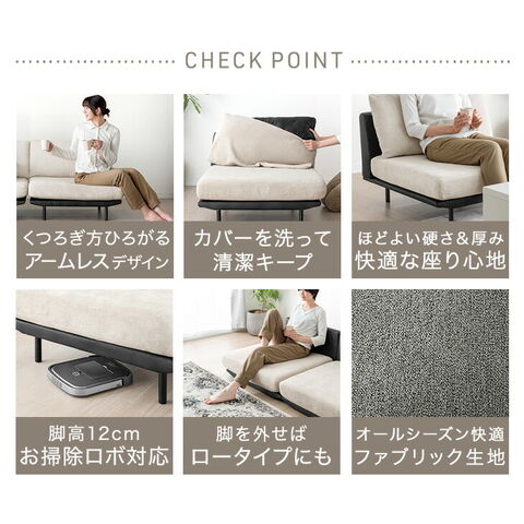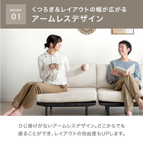 ・くつろぎの幅ひろがるアームレスデザイン ・シーンに合わせて組み換えOK ・モダンなレザーフレーム ・防虫効果のあるユーカリ材使用 ・カバーを洗って清潔キープ ・オールシーズン快適 ファブリック ・お掃除ロボ対応&脚を外せばロータイプにも |