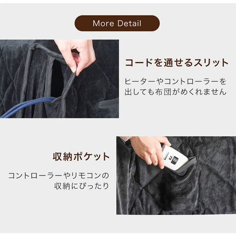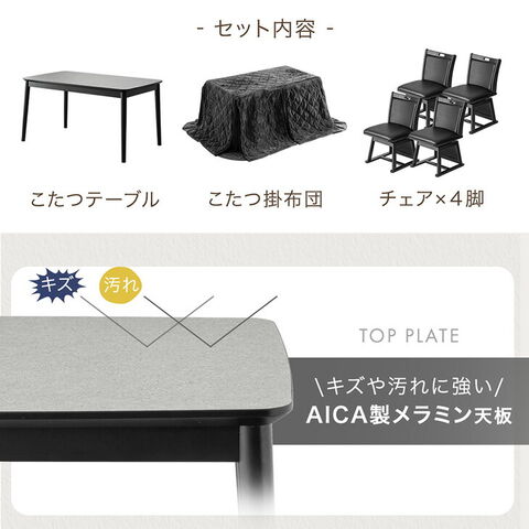 【こたつ本体】 ・オールシーズンおしゃれに使える モダンスタイル ・傷や熱に強いAICA製メラミン天板 ・速暖&長寿命のハロゲンヒーターこたつ ・確かな品質、メトロ工業製ヒーター ・こたつ内をムラなく暖めるモーターファン ・操作しやすい手元コントローラー 【チェア】 ・立ち座りが楽な回転式チェア ・長時間座っても快適なクッション座面 【掛け布団】 ・手触りが良く暖かいフランネル掛布団 ・リモコンなどを収納できるポケット付き |