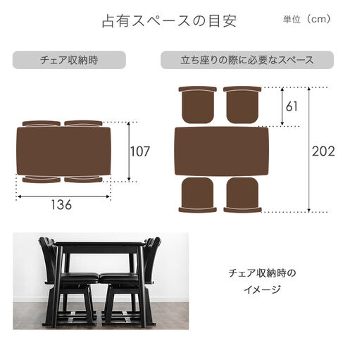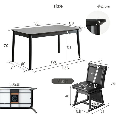 【こたつ本体】 外寸:136×80×70cm 天板厚:3cm 【掛け布団】 135×80×80cm 【チェア】 外寸:幅45×奥行51×高さ75cm 座面高:40cm |