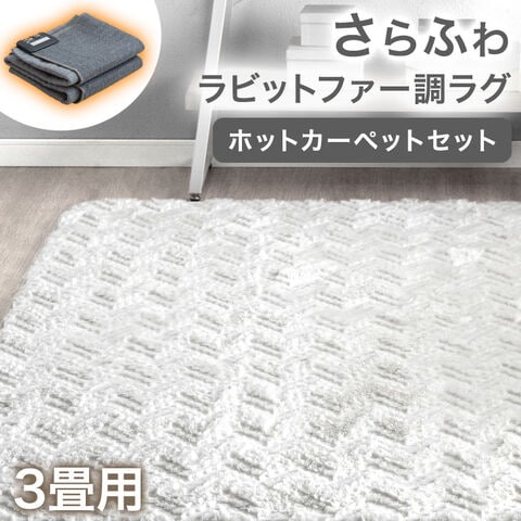 【即納】 ラビットファー調ラグ+ホットカーペット2点セット 3畳 ラグマット シャギーラグ 床暖房カーペット 電気マット カーペット 足元暖房 オールシーズン 絨毯 おしゃれ 99993039〔ホワイト〕