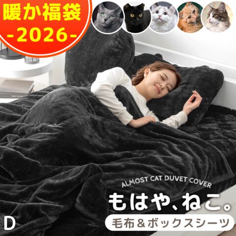 ★2026暖か福袋★ もはや、ねこ。[2枚合わせ 毛布+ボックスシーツ] 洗える 二枚合わせ ブランケット ダブル 暖かい 掛布団 シーツ 敷きパッド あったか 冬 厚手 猫毛布 猫 福袋 寝具 99993101〔ボンベイブラック〕