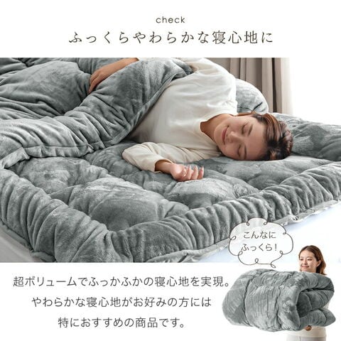 【掛け布団】 ■スタンダードタイプ (シングルサイズ)3.3kg [中綿充填量1.5kg] (セミダブルサイズ)3.7kg [中綿充填量1.7kg] (ダブルサイズ)4.2kg [中綿充填量1.9kg] ■極暖タイプ (シングルサイズ)3.5kg [中綿充填量1.8kg] (セミダブルサイズ)3.9kg [中綿充填量2.0kg] (ダブルサイズ)4.3kg [中綿充填量2.2kg] 【敷パッド】 (シングルサイズ)1.7kg [中綿充填量0.8kg] (セミダブルサイズ)2.1kg [中綿充填量1kg] (ダブルサイズ)2.3kg [中綿充填量1.1kg] |
