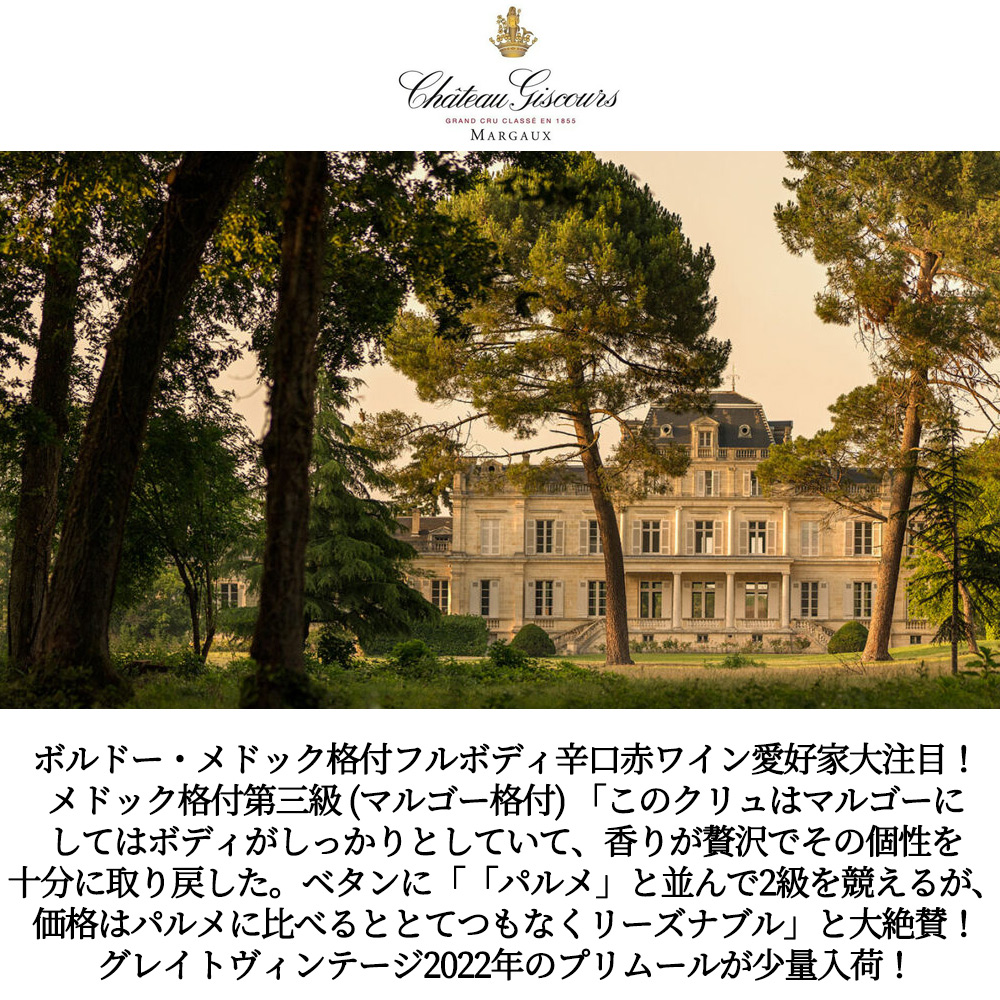 シャトー ジスクール 2022 メドック グラン クリュ クラッセ メドック格付第三級 AOCマルゴー <br>Chateau Giscours 2022 Grand Cru Classe du Medoc en 1855 AOC Margaux