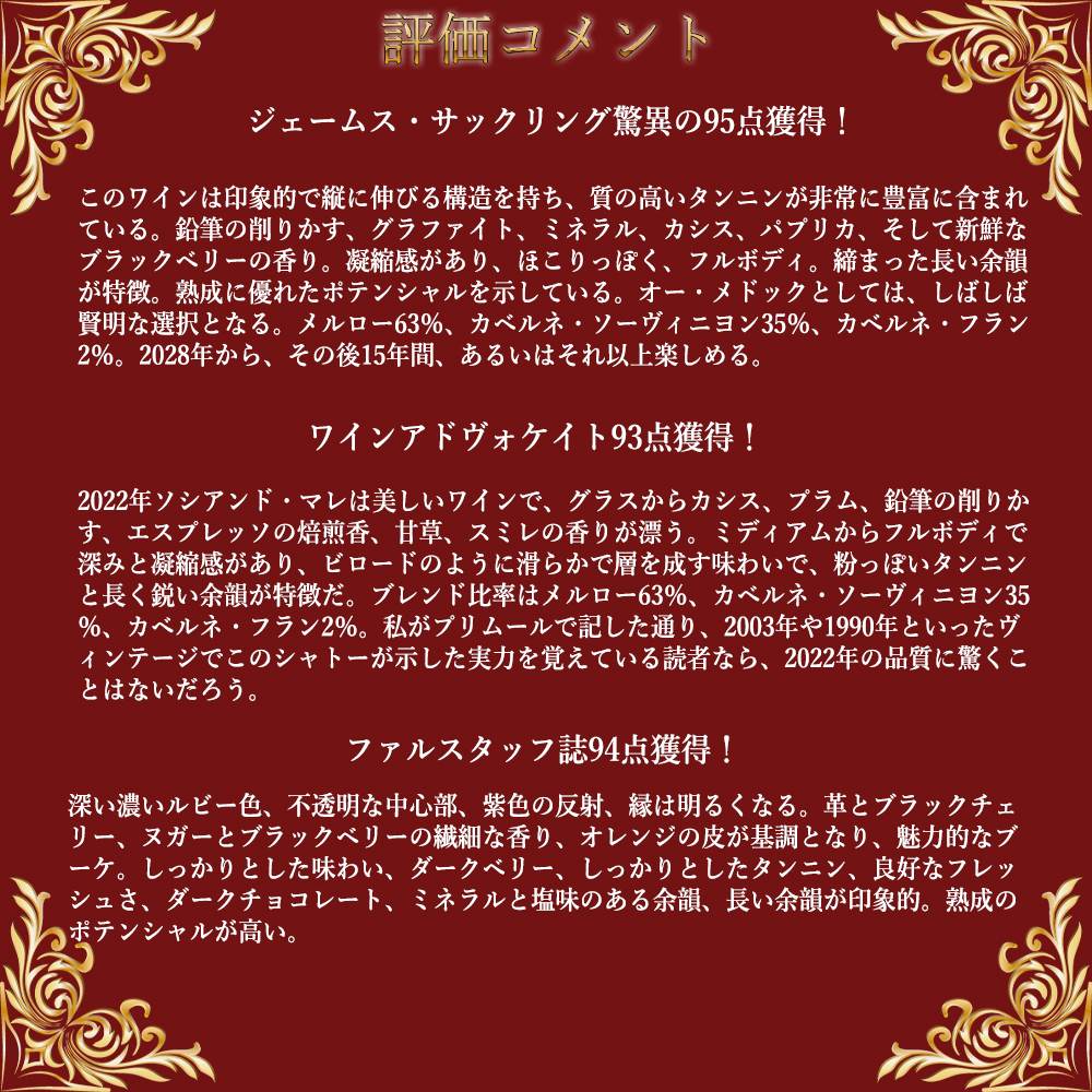 【商品説明】ボルドー・オー・メドック大人気フルボディ辛口赤ワイン愛好家大注目!シャトー・ソシアンド・マレの1stラベル(グラン・ヴァン)!待望の超グレイトヴィンテージ[2022]年もの(2022年は、ボルドー全域で素晴らしい天候に恵まれた歴史的ヴィンテージ!ワインアドヴォケイト誌のヴィンテージチャートにボルドー全域で95点台以上を獲得という素晴らしいヴィンテージ)で待望入荷! 創設者のジャン・ゴトロー氏は、2019年11月に亡くなられ、ワイナリーを一人娘のシルヴィが継承!2019年からは一人娘のシルヴィー氏の記念すべき初ヴィンテージとして登場!メドック・グラン・クリュ(格付)と同等の評価を受ける大人気究極オー・メドック!厳しい評価で知られるレ・メイユール・ヴァン・ド・フランス(旧クラスマン)は5大シャトーに次ぐ★★(ダブルスター)評価(これは人気急上昇中のポンテ・カネやローザン・セグラと同評価)をし、「この25年でメドックのクリュ・ブルジョワの中で最も名高いものとなり、グラン・クリュ (格付) 3級の候補にまで挙げている。素晴らしいアロマ、力強さ、濃厚さ、よくとけこんだ樽香、2世代に及ぶ長い熟成が可能だというようなグラン・ヴァンをセレクションできるまでになっている」と激賞!ロバート・パーカー氏は4つ星をつけ、「多くの格付けワインと優に肩を並べることができ、フランスのワイン通の間で評判が高まっている。その大半がフランス国内で買われていることからもすでに証明済である」と絶賛! このスーパーグレイトV.T2022年でジェームス・サックリング驚異の95点でコメントは『このワインは印象的で縦に伸びる構造を持ち、質の高いタンニンが非常に豊富に含まれている。鉛筆の削りかす、グラファイト、ミネラル、カシス、パプリカ、そして新鮮なブラックベリーの香り。凝縮感があり、ほこりっぽく、フルボディ。締まった長い余韻が特徴。熟成に優れたポテンシャルを示している。オー・メドックとしては、しばしば賢明な選択となる。メルロー63%、カベルネ・ソーヴィニヨン35%、カベルネ・フラン2%。2028年から、その後15年間、あるいはそれ以上楽しめる。』! ワインアドヴォケイト93点でコメントは『2022年ソシアンド・マレは美しいワインで、グラスからカシス、プラム、鉛筆の削りかす、エスプレッソの焙煎香、甘草、スミレの香りが漂う。ミディアムからフルボディで深みと凝縮感があり、ビロードのように滑らかで層を成す味わいで、粉っぽいタンニンと長く鋭い余韻が特徴だ。ブレンド比率はメルロー63%、カベルネ・ソーヴィニヨン35%、カベルネ・フラン2%。私がプリムールで記した通り、2003年や1990年といったヴィンテージでこのシャトーが示した実力を覚えている読者なら、2022年の品質に驚くことはないだろう。』! ファルスタッフ誌94点でコメントは『深い濃いルビー色、不透明な中心部、紫色の反射、縁は明るくなる。革とブラックチェリー、ヌガーとブラックベリーの繊細な香り、オレンジの皮が基調となり、魅力的なブーケ。しっかりとした味わい、ダークベリー、しっかりとしたタンニン、良好なフレッシュさ、ダークチョコレート、ミネラルと塩味のある余韻、長い余韻が印象的。熟成のポテンシャルが高い。』と高評価! 格付シャトーに匹敵する実力を持つという評価を得て、亡きジャン・ゴートロー自身「格付もクリュ・ブルジョワの肩書きもいらない。ソシアンド・マレは、ただ最大限の力を発揮するだけだ」と、覆すクリュの独立独歩の地位を謳歌! 大人気オー・メドックのファースト!高級格付を凌駕したずばり究極ソシアンド・マレの偉大ヴィンテージで高評価連発[2022]年が限定で極少量入荷!