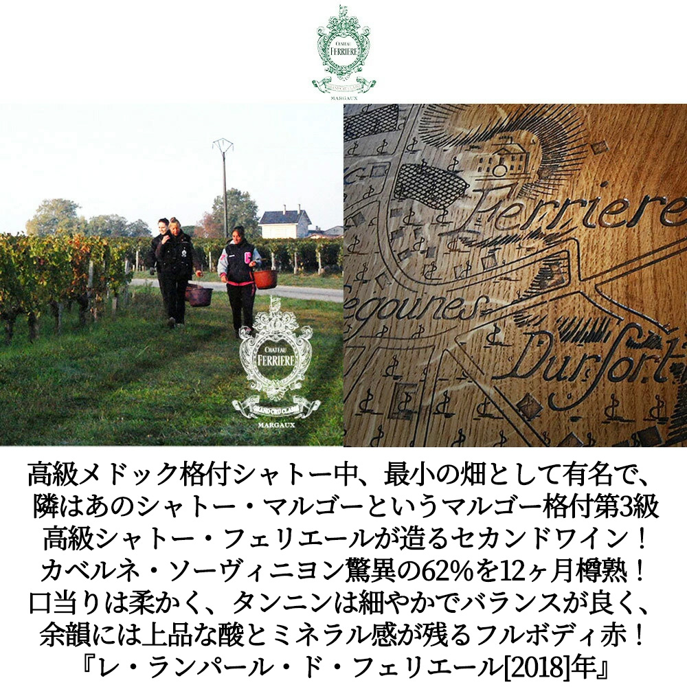 【商品説明】メドック格付フルボディ辛口赤ワイン愛好家大注目!マルゴー格付ファン大注目!シャトー・フェリエールのセカンドラベル“レ・ランパール・ド・フェリエール”がグレイトヴィンテージ[2018]年(ワインアドヴォケイト誌のヴィンテージチャートでマルゴーに94点を付けるグレイトヴィンテージ)!メドック格付シャトー中、最小の畑から(隣はあのシャトー・マルゴー)、しかもカベルネ・ソーヴィニヨンの比率が最も高いシャトーとして有名な造り手による大人気マルゴー格付! オーナーは女性のクレラ・ヴィラエール女史!あの有名なシャトー・オー・バージュ・リベラルやシャトー・ラギュルグのオーナーでもあります!同族のジャン・メルロー氏はシャトー・グリュオー・ラローズのオーナー、アントワーヌ・メルロー氏はシトランのオーナーであり、フランスで実力を誇るワイン会社タイアン・グループの社長というまさにボルドーワイン界のサラブレッド!なんと!コンサルタントは、メドックの影の立役者であるジャック・ボワスノ氏!シャトー・フェリエールが極少量生産造るセカンドラベル!レ・ランパール・ド・フェリエール! このセカンドはファーストと同じ醸造チームがファーストと同じノウハウで醸造!ファーストでは使われない若樹ブドウを使用!カベルネ・ソーヴィニヨン驚異の62%にメルロー32%、プティ・ヴェルド6%をフレンチオーク樽にて12ヶ月(新樽、1年、2年使用樽、225L)熟成で造られるフルボディ辛口赤ワイン! この2018年でフォルスタッフ誌驚異の93点でコメントは『濃いルビー色に紫がかった反射、縁に控えめな黄土色の輝き。ハーブと香ばしい香りにタバコ、ブラックベリーの果実味、さらにクランベリー、ヌガー、深みのあるミネラル感が調和。中程度の複雑さを持ち、繊細なサワーチェリーが感じられる。フレッシュな骨格に上質なタンニンが絡み、長く塩味を帯びた余韻。既に熟成が進み、エレガントな食中酒として完成されている。』と大絶賛! カシスやブラックチェリーの芳醇な果実味に加え、スミレやシダー、ほのかなスパイスの香りが重なります!口当たりは柔らかく、タンニンは細やかでバランスが良く、余韻には上品な酸とミネラル感が残ります! 若いうちから楽しめる親しみやすさも魅力ですが、熟成も可能な高級マルゴー!レ・ランパール・ド・フェリエールの飲み頃7年熟成でグレイトヴィンテージ[2018]年ものが限定で少量入荷!