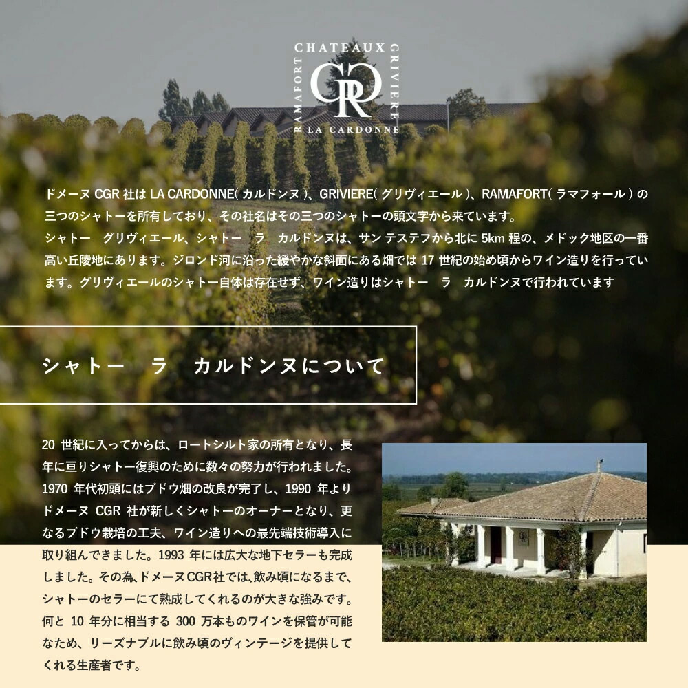 【商品説明】入手困難!ボルドーメドックファン大注目!超希少飲み頃!究極フルボディワイン! メドック格付第1級のシャトー・ラフィット・ロートシルトが1989年まで所有していたメドック一番の高台にあるクリュ・ブルジョワ級人気シャトー!からロバート・パーカー氏大注目!ワインスペクテーター誌大注目!アシェットガイド誌、R.V.F誌、世界のワイン評価誌軒並み注目の人気ワイン! しかも最強スーパーグレートヴィンテージ!ボルドーの偉大[2015]年もの (なんと!フランス権威評価誌アシェット・ガイド誌2017年版では、1982年や1990年、2000年、2005年、2009年、2010年のスーパーグレイトと同評価の最高評価。さらにワインアドヴォケイト誌もメドックの各AOCに93点以上付けるスーパーグレイトヴィンテージ) ! 歴史について、17世紀からその名を残すシャトー「ラ・カルドンヌ」!20世紀にはロートシルト家の所有下でシャトー復興のために数々の努力が行われました!1970年代初頭にはブドウ畑の改良が完了!1990年よりドメーヌCGR社が新しくシャトーのオーナーとなり、更なるブドウ栽培の工夫、ワイン造りへの最先端技術導入に取り組んできました!1993年には広大な地下セラーも完成!その為、ドメーヌCGR社では、飲み頃になるまでシャトーのセラーにて熟成してから出荷するのが大きな強みです!何と10年分に相当する300万本ものワインを保管が可能なため、リーズナブルに飲み頃のヴィンテージを提供してくれる生産者!ドメーヌCGR社がオーナーになった当初はシャトー・ラフィット・ロートシルトの醸造責任者エリック・ファーブル氏がコンサルタントを行っていました!その後、ラフィットを引退したファーフル氏が改めて醸造長に就任!そして、2000年にはシャトー・ランシュ・バージュ、レ・ゾルム・ド・ペズで醸造長を務めていた女性醸造家マガリ・ギュイヨン氏が醸造長となりました! 平均樹齢31年のメルロー60%、カベルネ・ソーヴィニヨン40%をアリエ産フレンチオーク (新樽50%) で12ヶ月熟成!その後、ステンレスタンクで18ヶ月間落ち着かせた後ボトリング、地下セラーにて出荷まで熟成のこだわり品!厚みがあり、溢れんばかりの果実味、絹のようなタンニンと、フィネス満杯!のフルボディ赤ワインが飲み頃9年熟成バックヴィンテージで、超大当たり[2015]年で希少なハーフサイズ (375ml) で限定で蔵出しで少量入荷!