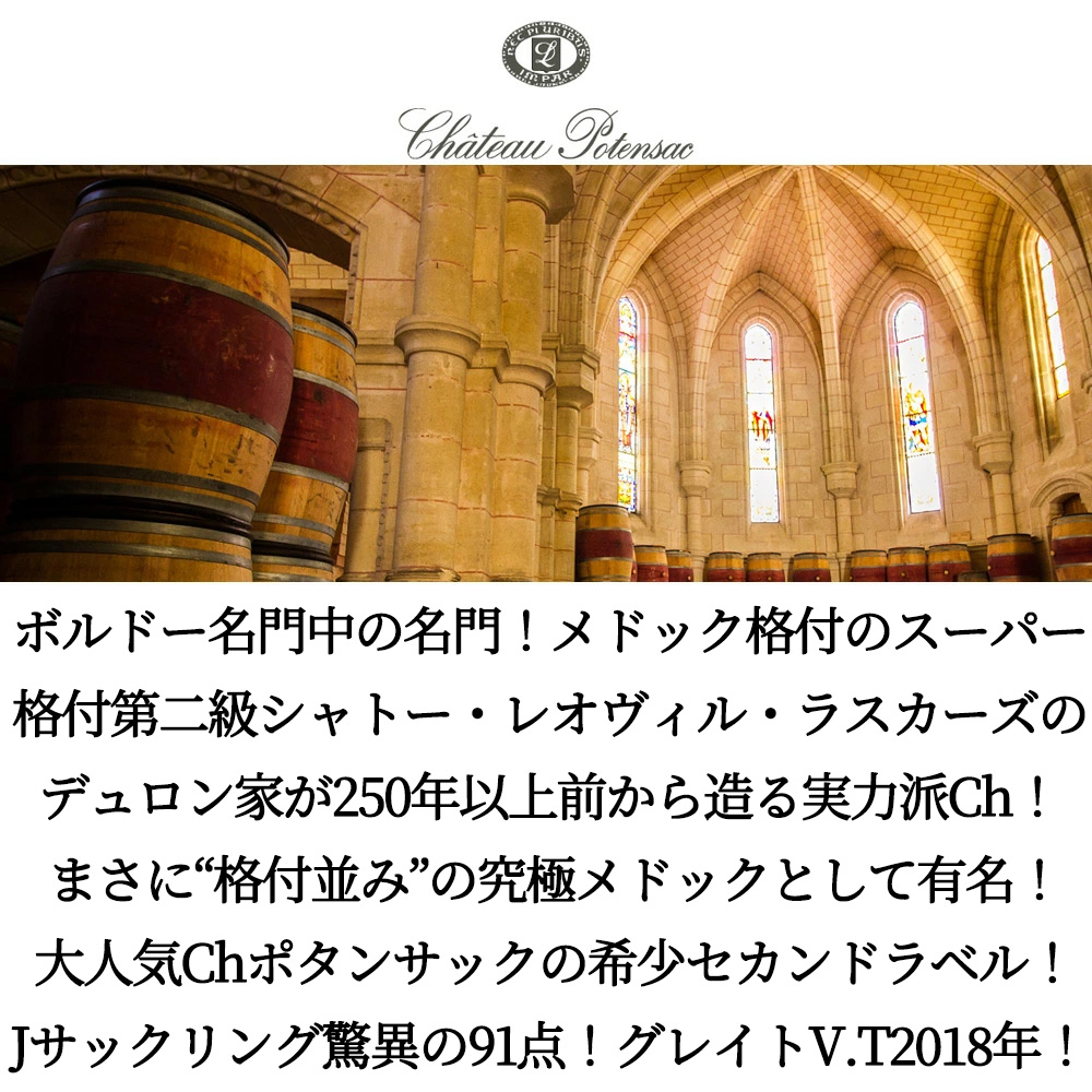 【商品説明】ボルドー北部メドック究極フルボディ赤ワイン愛好家大注目!名門中の名門!メドック格付のスーパー第2級のシャトー・レオヴィル・ラスカーズのDelon(デュロン)家が250年以上前から造る格付シャトー並みの実力派シャトー!の究極メドック(旧クリュ・ブルジョワ)からの人気2ndラベル!しかも待望のグレイトヴィンテージ[2018]年もの (ワインアドヴォケイト誌でもサンジュリアン、ポイヤック、サンテステフに驚異の94点を付けるグレイトヴィンテージ2018年)で待望入荷! ロバート・パーカー氏には3つ星生産に挙げさせ、「ここのワインはドゥロンの特徴である、豊かさとカシスとベリーのような個性を持ち、優れた骨格がありすばらしい純粋さとバランス、そして驚異的な熟成の可能性を示している。」「熱心なボルドー愛好家なら試さなければおかしいとさえ言えるワインである。」と絶賛させ、この2018年の1stに90-92点の高評価!ジェイムス・サックリングからも93-94点!ジェブ・ダナック91-93点!ヴィノス90-92点! このシャペル・ポタンサックでもジェームス・サックリング驚異の91点でコメントは『ブラックベリー、キノコ、土の香りが鼻をくすぐる。口に含むとエレガントなタンニンと旨味のあるジューシーな質感が広がり、風味豊かな余韻へと続く。軽やかなジューシーさ。現時点では中盤にわずかな空洞感があるが、よく出来ている。2022年以降、より丸みを帯びて熟成が進むとさらに良くなるだろう。』と大注目!ヴィノス89点!デカンタ88点高評価!ヒュー・ジョンソン氏は「滑らかで芳醇なバランスのとれたワイン」と高評価! メルロー70%、カベルネ・ソーヴィニヨン25%、カベルネ・フラン5%(メルローからはフルーティーでやわらかなタンニンを、カベルネソーヴィニヨンからはシルキーさも兼ね備えた力強さを、カベルネフランからは高密度な複雑さを与えられます。)をメドックでは珍しく、すべて手摘み(100%)!しかも非常に希少!でセカンドでありながら果実味が充実し全体に柔らかなタンニンと活気溢れる味わいで食中ワインとしても人気があります! ブラックチェリーやカシス、湿った森の香りに焦がしたオークの風味、よく溶け込んだタンニンと果実味がたっぷりと感じられる究極フルボディ辛口赤ワインの大人気グレイトヴィンテージ[2018]年ものが限定でしかもお買い得価格で限定少量入荷!