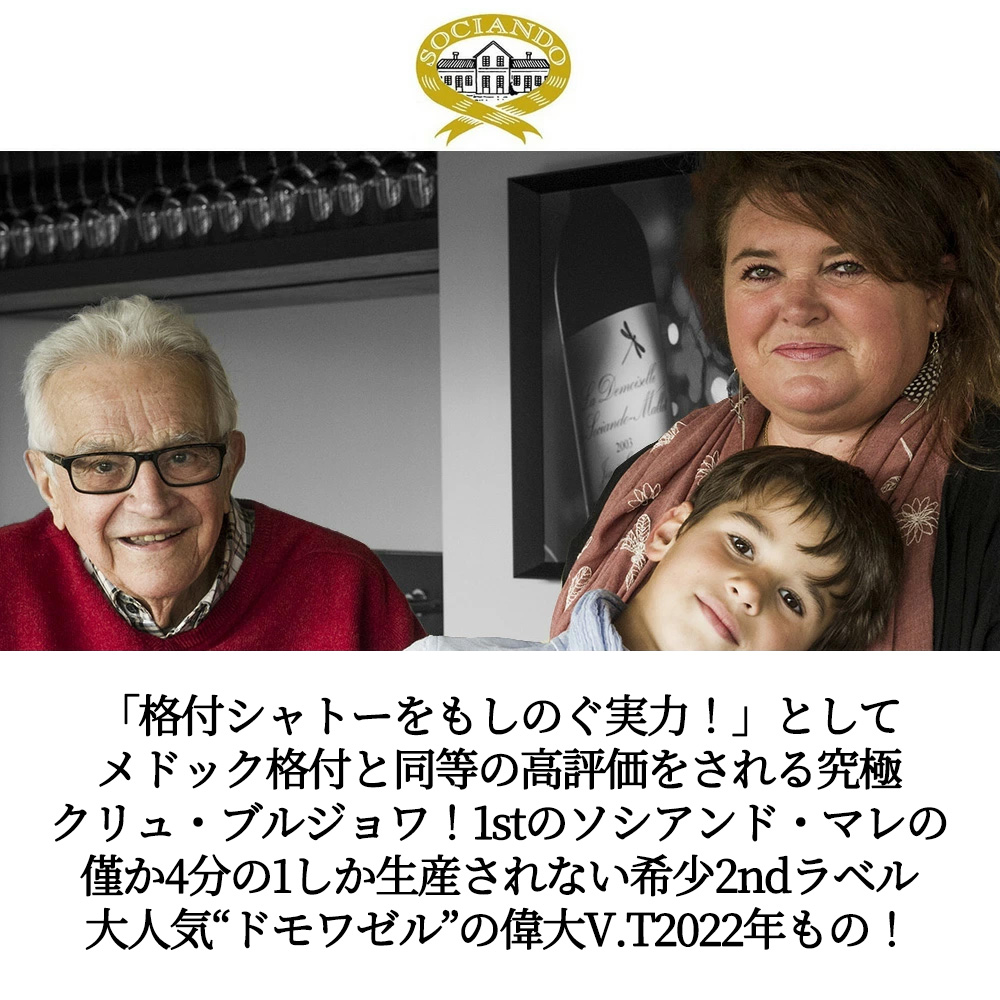 【商品説明】ボルドー オー・メドック大人気フルボディ辛口赤ワイン愛好家大注目!今やメドック格付と同等の評価をされる究極オー・メドックワイン!しかもスーパーグレイトヴィンテージ (RVF誌2025年版ではボルドーの赤の2022年に驚異の99点&ワインアドヴォケイト誌メドックの多くに驚異の95点を付ける最高評価スーパーグレイトヴィンテージ!) [2022]年で待望入荷! (事実、Liv-exの2009年格付では、1stのソシアンド・マレを格付第5級に!しかも格付を含む2009年度のボルドーのランキングでは、格付3級のボイド・カントナックに次ぐ46位にランキング!) という、まさに格付並みの扱い! 厳しい評価で知られるル・メイユール・ヴァン・ド・フランス (旧クラスマン) は5大シャトーに次ぐWスター★★評価をつけ、「この25年でメドックのクリュ・ブルジョワの中で最も名高いものとなり、グラン・クリュ (格付) 3級の候補にまで挙げている。素晴らしいアロマ、力強さ、濃厚さ、よくとけこんだ樽香、2世代に及ぶ長い熟成が可能だというようなグラン・ヴァンをセレクションできるまでになっている」と激賞し、高評価! ゴーミヨ誌では★★★★★5つ星で絶賛!ロバート・パーカー氏に到っては4つ星をつけ、「多くの格付けワインと優に肩を並べることができ、フランスのワイン通の間で評判が高まっている。その大半がフランス国内で買われていることからもすでに証明済である」と絶賛! (2022年ものの1stで高評価獲得) ベタンヌ&ドゥソーヴでは3B&Dマークをつけ、「ワインには偉大な産地のカベルネのとてもスパイシーなブーケと、やや重い土地からできた驚くべきメルローの滑らかなテクスチュアが感じられる。このため、あらゆる愛好家を喜ばせる」と、これまた大絶賛! この2022年でジェームス・サックリング驚異の93点でコメントは「スパイスを効かせたチェリー、カシス、ミネラル、オリーブ、パプリカのフレッシュな香り。口当たりはジューシーでミディアムボディ、繊細なタンニンが感じられる。清らかで果実味豊かな余韻が長く続く。見事なバランス。肉厚というより石のような質感。」と大注目!格付けシャトーに匹敵する実力を持つという評価を得て、ジャン・ゴートロー自身「格付もクリュ・ブルジョワの肩書きもいらない。ソシアンド・マレは、ただ最大限の力を発揮するだけだ」と、覆すクリュの独立独歩の地位を謳歌!ずばりその1stのわずか4分の1しか生産されない希少な2ndラベル“ドモワゼル” (前にしか進まず退かないところから、「不退転」の精神を表すものとして「勝ち虫」とも呼ばれ、非常に縁起の良いトンボマーク) のスーパーグレイトヴィンテージ[2022]年ものが限定で少量入荷!