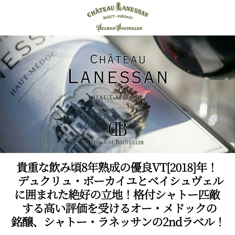 【商品名】レ・カレッシュ・ド・ラネッサン[2018]年・AOCオー・メドック(シャトー・ラネッサン・2ndラベル)・シャトー元詰(ブーティエ家元詰)【英名】Les Caleches de Lanessan 2018 AOC Haut Medoc (Chateau Lanessan 2nd Label)