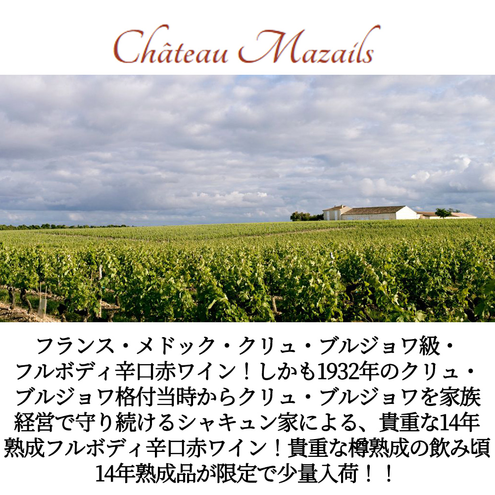 シャトー マザイル メドック クリュ ブルジョワ 2012 シャトー元詰 AOCメドック クリュ ブルジョワ オーク樽で12ヶ月間熟成 14年熟成作品 Chateau Mazails 2012 AOC Medoc Cru Bourgeois