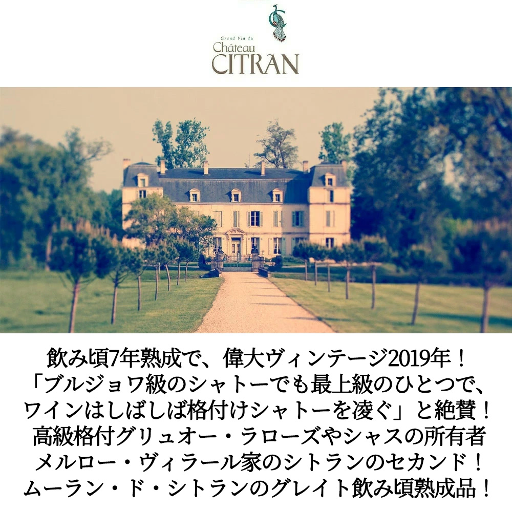 【商品説明】ボルドー・オー・メドック赤ワイン愛好家大注目!しかもスーパーグレイトヴィンテージ[2019]年 (アシェット・ガイド誌2023年版がボルドーの赤に18/20点を付け、『レヴュ・ド・ヴァン・ド・フランス2023年版』でも驚異の97点を付け、ワインアドヴォケイト誌もマルゴー、サンジュリアン、サンテステフ、ポイヤックに驚異の96点を付けるスーパーグレイトヴィンテージ[2019]年) の飲み頃7年熟成作品! パーカー氏をして「ここはブルジョワ級のシャトーでも最上級の1つで、ワインはしばしば格付けシャトーをしのぐ」と大絶賛!あの銘醸シャトー・シトランの希少セカンドワイン!ファーストの[2015]年はフォルスタッフマガジンやジェームス・サックリング、ワインエンスージアスト誌、ジルベール&ガイヤール、ワインスペクテーター誌等高評価!シャトー・グリュオー・ラローズやシャトー・シャススプリーン、シャトー・フェリエール等の所有者でもあるメルロー・ヴィラール家(ボルドー指折りタイヤングループ)の手に戻って人気も品質も急上昇!シャトー・シトランのセカンド!ムーラン・ド・シトランの超グレイト飲み頃熟成品! 粘土石灰質土壌からの平均樹齢28年のカベルネ・ソーヴィニヨン58%とメルロー42%をオーク樽12ヶ月 (1年、2年落ちの樽のみ使用、225L) 熟成で造られる究極フルボディ辛口赤ワイン!シャトー・シトランよりは幾分ライトな味わいですが、熟した果実味に、十分なタンニンによるコクがありながら、しなやかな舌触りが楽しめる素晴らしいバランスの高級オー・メドック“シトラン”の超人気セカンド“ムーラン・ド・シトラン”の飲み頃で、偉大ヴィンテージ[2019]年もので限定で少量入荷!