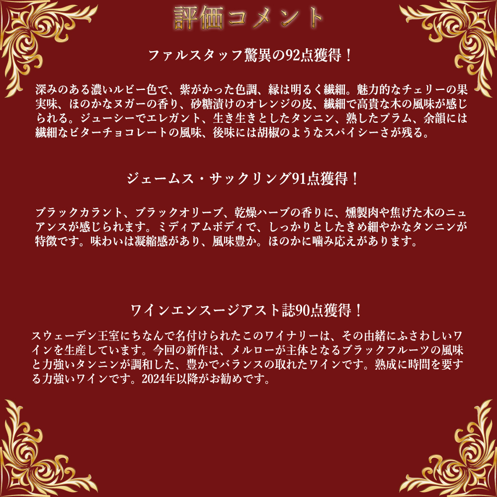 【商品説明】入手困難!ボルドー オー・メドック・フルボディ辛口赤ワイン愛好家大注目!愛好家待望の超グレイトヴィンテージ[2018]年もの!(2018年は、ワインアドヴォケイト誌のヴィンテージチャートにてサンジュリアン、ポイヤック、サンテステフ、マルゴーに96点を付ける素晴らしいヴィンテージ)!スウェーデン王室ご用達!であり、メドック格付第一級のシャトー・ラトゥールやラフィットなどの五大シャトーと張り合い、時には互角に勝負できると言われるスーパー・セカンド!ピション・ロングヴィル・ラランドの運営(2012年からは香港の免税事業などを手掛けるキング・パワー・グループの所有)による大人気オー・メドック! ピション・コンテス・ドゥ・ラランドの弟分ということで、別名“プティ・コンテス”と呼ばれる傑作ボルドー!ヒュー・ジョンソン氏にWスターをつけさせ、「ピションのラランドが運営する小さなシャトーで注目すべきワインのひとつ。上質の、構成のしっかりしたワイン。」と激賞させ、ロバート・パーカー氏は3つ星生産者に挙げ大注目! この[2018]年でファルスタッフ驚異の92点でコメントは「深みのある濃いルビー色で、紫がかった色調、縁は明るく繊細。魅力的なチェリーの果実味、ほのかなヌガーの香り、砂糖漬けのオレンジの皮、繊細で高貴な木の風味が感じられる。ジューシーでエレガント、生き生きとしたタンニン、熟したプラム、余韻には繊細なビターチョコレートの風味、後味には胡椒のようなスパイシーさが残る。」! ジェームス・サックリング91点でコメントは「ブラックカラント、ブラックオリーブ、乾燥ハーブの香りに、燻製肉や焦げた木のニュアンスが感じられます。ミディアムボディで、しっかりとしたきめ細やかなタンニンが特徴です。味わいは凝縮感があり、風味豊か。ほのかに噛み応えがあります。」! ワインエンスージアスト誌90点でコメントは「スウェーデン王室にちなんで名付けられたこのワイナリーは、その由緒にふさわしいワインを生産しています。今回の新作は、メルローが主体となるブラックフルーツの風味と力強いタンニンが調和した、豊かでバランスの取れたワインです。熟成に時間を要する力強いワインです。2024年以降がお勧めです。」! クラスマン誌(現レ・メイユール・ヴァン・ド・フランス)には「非常にバランスが良く、しっかりとした構成で、又、見事なストラクチャーを持っている。カベルネ・ソーヴィニヨンのブレンド比率が高いおかげで、そのストラクチャーときめの細やかさに確かな気品が表れる」と激賞させた、カベルネ・ソーヴィニヨン50%、メルロ44%、カベルネ・フラン4%、プテイ・ヴェルド2%をメドックにして手摘み100%!オーク樽12ヶ月~18ヶ月熟成!の究極フルボディ辛口赤ワインが、希少な飲み頃8年熟成バックヴィンテージ大人気グレイトヴィンテージ[2018]年もので極少量入荷!