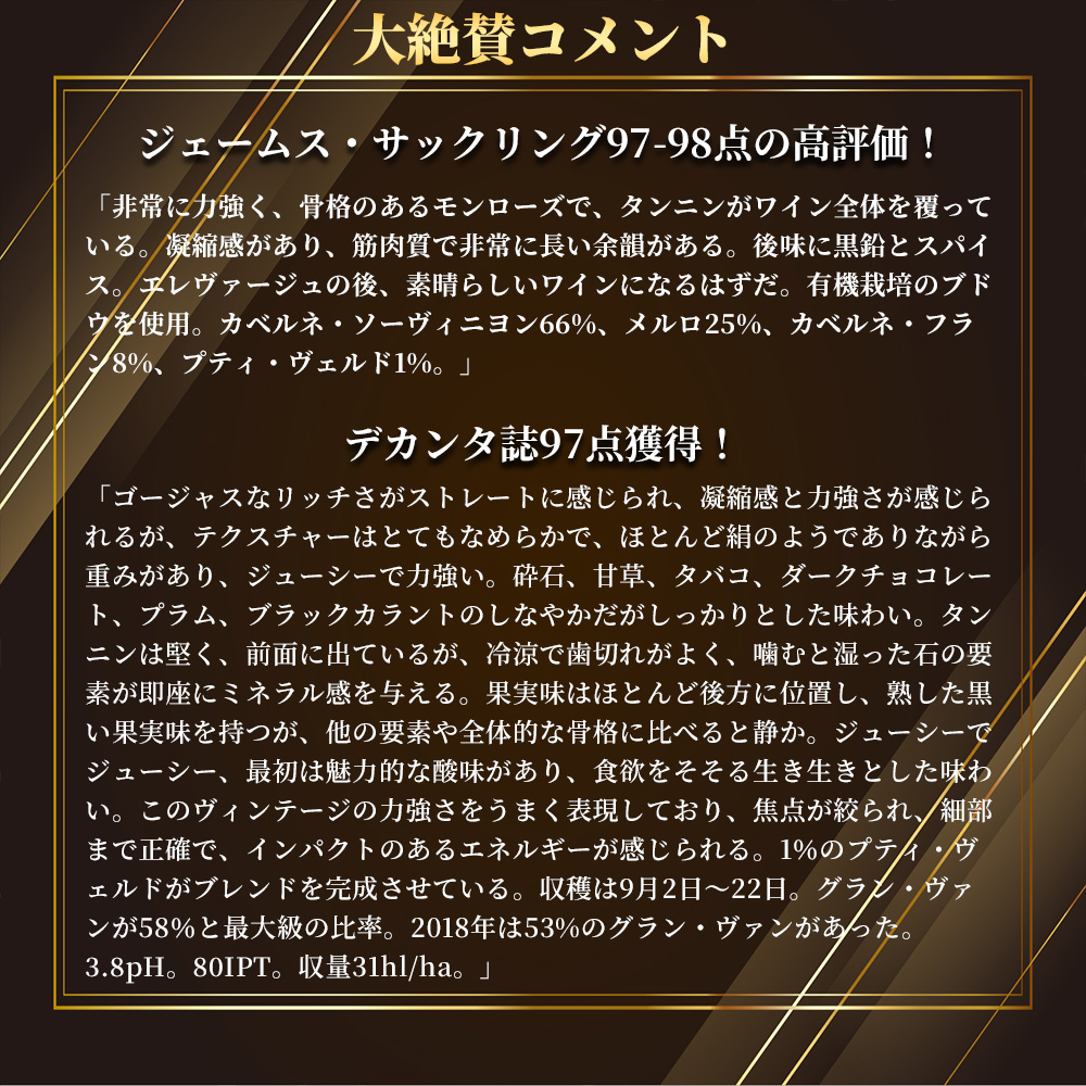 【商品説明】高級メドック究極格付フルボディ赤ワイン愛好家大注目!サンテステフ格付ファン大注目!あの怪物級!サンテステフ格付ワイン!ついにこのスーパーグレイト[2022]年でもワインアドヴォケイト誌100点満点獲得!クラシックボルドーの典型!スーパー格付第2級!高評価続出の大人気グレイトヴィンテージ[2022]年のプリムールものがついに入荷! ロバート・パーカー氏には満点★★★★★5つ星をつけさせ、「格付が見直されることがあれば、モンローズはメドックの一級に格付されるかもしれない」と絶賛させ、2009年、2010年の2年連続パーカーポイント100点満点獲得!2020年に引き続きこの2022年でも遂に100点満点獲得!べた褒めコメントは「樽の時点から、2022年モントローズは非常に魅力的で、括弧付きの点数をつけるのは単なる形式的なことに思える、と書いたが、それが証明された。カシス、野生のブルーベリー、スミレ、鉛筆の削りカス、燃えさかる炎を思わせる深く陰鬱なブーケがグラスの中で解き放たれ、フルボディで深みがあり、濃密である。幅広く、口中に広がるフィニッシュは1分以上続く。読者はこのワインを見逃すことはないだろう。」と大絶賛コメント! さらにジェブ・ダナック100点満点でコメントは「このヴィンテージの偉大なシャトーのひとつである2022年のシャトー・モンローズは、深いルビー/紫色を帯び、甘いクレーム・ド・カシス、甘ったるいタバコ、削りたての鉛筆のような重厚な香りを持つ。アロマは驚くほどピュアで正確、口に含むとフルボディの豊かさ、重層的で力強く、それでいてどこかエレガントな口当たり、超微細なタンニン、素晴らしい余韻が広がる。カベルネ・ソーヴィニヨン65%、メルロ25%、カベルネ・フラン8%、残りはプティ・ヴェルドというクラシックなブレンドをベースに、60%の新樽で18ヶ月間熟成させた。アン・プリムールの時に書いたように、モンローズのようなエッセンスを持っている。このシャトーの例としては、極端に後進的で渋いわけではないが、それでも10~12年の瓶熟に値し、少なくとも半世紀は持つだろう。間違いなく、1989年、1990年、2003年、2009年、2010年、2016年、2018年、2020年と同レベルのワインである。」! ヴィノス誌100点満点でコメントは「2022年モンローズはめちゃくちゃ美しい。それだけは明らかだ。いつ飲み頃になるかは別の問題だ。近年、モンローズはタンニンに顕著なフィネスを獲得しているので、それは問題ではない。しかし、2022年はとてつもない密度と凝縮感が詰まっており、柔らかくなるには時間が必要だろう。ブラックベリー、黒鉛、甘草、ラベンダー、チョコレートが味わいを染め上げ、驚くほど魅力的な最高レベルのワインに仕上がっている。2022年が美味しく飲めるようになる頃、私はそばにいたいと願うばかりだ!モントローズは間違いなくこのヴィンテージのワインのひとつだ。忘れられない。」と大激賞! ジェームス・サックリング97-98点でコメントは「非常に力強く、骨格のあるモンローズで、タンニンがワイン全体を覆っている。凝縮感があり、筋肉質で非常に長い余韻がある。後味に黒鉛とスパイス。エレヴァージュの後、素晴らしいワインになるはずだ。有機栽培のブドウを使用。カベルネ・ソーヴィニヨン66%、メルロ25%、カベルネ・フラン8%、プティ・ヴェルド1%。」! デカンタ97点のコメントは「ゴージャスなリッチさがストレートに感じられ、凝縮感と力強さが感じられるが、テクスチャーはとてもなめらかで、ほとんど絹のようでありながら重みがあり、ジューシーで力強い。砕石、甘草、タバコ、ダークチョコレート、プラム、ブラックカラントのしなやかだがしっかりとした味わい。タンニンは堅く、前面に出ているが、冷涼で歯切れがよく、噛むと湿った石の要素が即座にミネラル感を与える。果実味はほとんど後方に位置し、熟した黒い果実味を持つが、他の要素や全体的な骨格に比べると静か。ジューシーでジューシー、最初は魅力的な酸味があり、食欲をそそる生き生きとした味わい。このヴィンテージの力強さをうまく表現しており、焦点が絞られ、細部まで正確で、インパクトのあるエネルギーが感じられる。1%のプティ・ヴェルドがブレンドを完成させている。収穫は9月2日~22日。グラン・ヴァンが58%と最大級の比率。2018年は53%のグラン・ヴァンがあった。3.8pH。80IPT。収量31hl/ha。」! カベルネ・ソーヴィニヨンとメルロー、カベルネ・フラン、プティ・ヴェルドで造られる、シャトー・モンローズらしい芳ばしい西洋杉とシガーボックス (タバコ) とプラムリキュールのアロマ!魅惑的な味わい深いフルボディ辛口赤ワインは、ボルドー サンテステフファンを納得させてくれます!サンテステフ格付のスーパー2級のスーパーグレイト!パーフェクトヴィンテージ[2022]年ものがプリムールもので限定で極少量入荷!