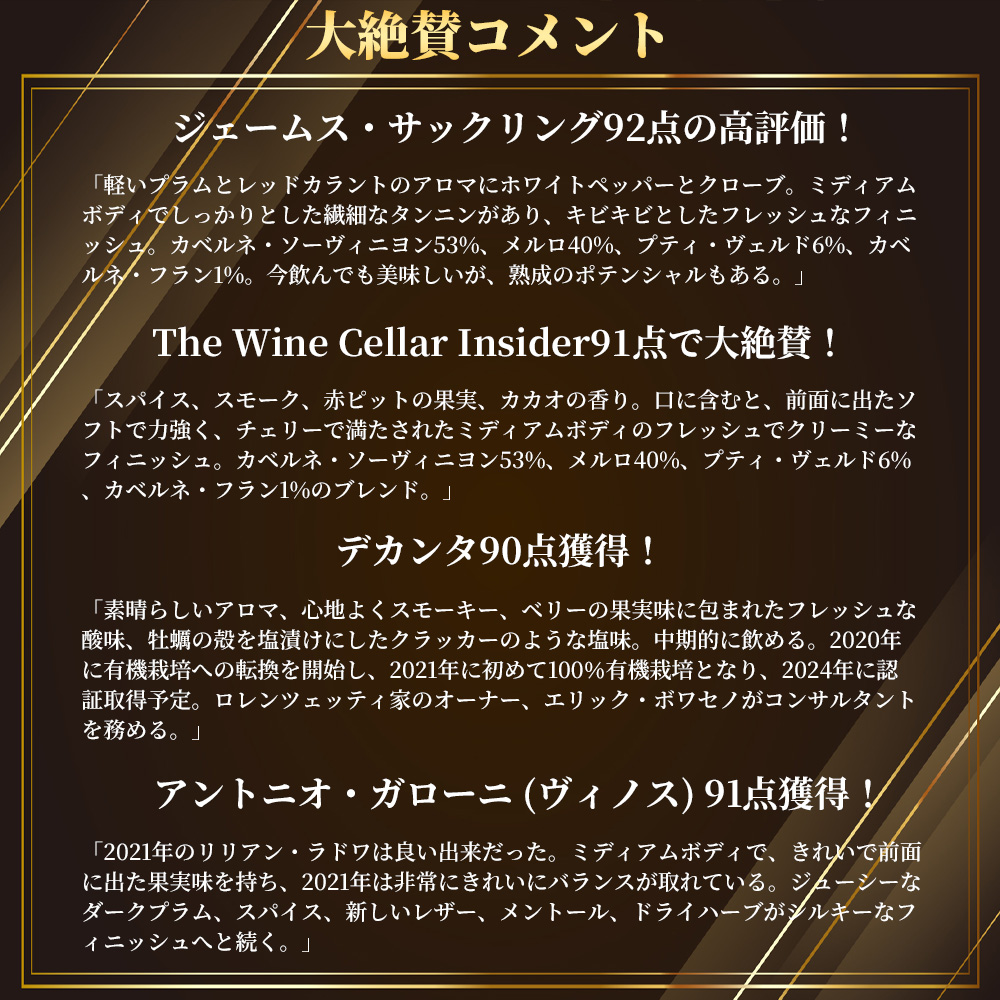 【商品名】シャトー・リリアン・ラドゥイ[2021]年・AOCサン・テステフ(旧クリュ・ブルジョワ級)・シャトー元詰・ジェームス・サックリング92点&The Wine Cellar Insider91点&デカンタ90点&アントニオ・ガローニ91点