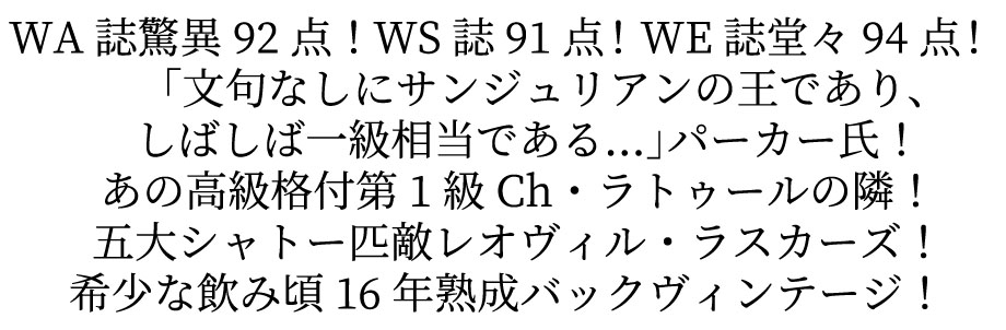 ![]() シャトー・レオヴィル・ラスカーズ[2007]年 ■ぶどう品種: カベルネ・ソーヴィニヨン85%(CS65%、CF14%)、メルロー18%、プティ・ベルド3% ベタンヌ&ドゥソーヴでももちろん満点5B&Dマークで、 「メドックの重要な生産者である「レオヴィル・ラスカーズ」のすべては「ラトゥール」の畑のすぐ隣にある自身の畑ル・グラン・アンクロの素晴らしいテロワールによるものだ。ミクロ・クリマが理想的に合わさり、カベルネ・ソーヴィニヨンが完璧に熟すことができる。彼らはグラン・ヴァンというものが、どういうものか理解しており、世界の最高のグラン・クリュに比肩する術を持っているので、将来を心配することはない」と大絶賛! ヒュー・ジョンソン氏には「他をひるませるほどの高い評判!不滅の構造をもつ」と言わしめた究極サン・ジュリアンの格付第二級! ![]() ![]() ![]() |