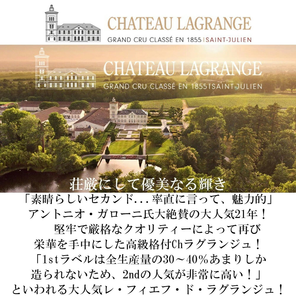 【商品説明】高級ボルドー・メドック格付フルボディ辛口赤ワイン愛好家大注目!メドック・サンジュリアン格付第三級!しかもグレイトヴィンテージ[2021]年もの! サンジュリアン村を代表する手摘み100%で丁寧に造られる格付シャトー!シャトー・ラグランジュからの2ndラベル!セカンドラベルとは言え、その品質基準は非常に高く、酒質は他の格付シャトーに匹敵します。厳しい評価で知られるル・メイユール・ド・ヴァン・ド・フランス (旧クラスマン) に「特筆に値する厳格なセレクションによってシャトー・ラグランジュは堅牢で色が濃く、古典的なメドックのタンニンを持つ、実に安定したワインを産出している。」と言わしめ、ベタンヌ&ドゥソーヴの“ル・グラン・ギ・ド・デ・ヴァン・デ・フランス誌2012年版”では、「テクスチュアの繊細さと洗練さが増しており、品格の面でも価値の面においても、レオヴィルに近づいている。」と大絶賛!で、1stに高評価!ゴーミヨ誌でも★★★★★5つ星!ロバート・パーカー氏は★★★★4つ星生産者に挙げ、この2020年の1stでワインアドヴォケイト誌驚異の92-94点!ジェームス・サックリング92-93点!デカンタ誌93点!ヒュー・ジョンソン氏にも「面積131haの畑は、現在最高の状態にあり、ワインもそれににつかわしいものになっている」と絶賛! ワイナリーは2021年について「2021年に記録された総雨量は、過去25年間の平均を下回った。ワインのバランスを保つために不可欠な要素である、生育サイクルを通じて気温が低く保たれたことは興味深い。6月から7月にかけてブドウの樹の手入れを行ったことで、ブドウは太陽の光を存分に浴びることができた。メルロの最初のバスケットは、天候が不安定な9月27日に収穫されたが、10月4日にインディアンサマーが始まった。私たちは時間をかけ、2日間収穫を中断することにした。危険な決断だったが、素晴らしいカベルネを収穫するためには必要な決断だった!収穫は10月12日に終わり、ブドウが日に日に成長していくのを観察し、次第に濃縮され、重量は30%まで減少し、タンニンと果皮はよりきめ細かくなり、有望なアロマが現れた。2021年ヴィンテージのバランスと調和は、2000年代に造られたワインを思い起こさせるが、タンニンの骨格とアロマの正確さがより高い品質となっている。2021年は我々のネオ・レトロ・ヴィンテージの最高峰となるだろう!」と大絶賛ヴィンテージ! なんと「1stラベルは全生産量の30~40%あまりしか造られないため、2ndラベルの人気が非常に高い」と言われます。ずばり大人気!メドック格付大三級!シャトー・ラグランジュの2ndラベル (カベルネ・ソーヴィニヨン40%、メルロー52%、プティ・ヴェルド8%をフレンチオーク樽13ヶ月熟成 (新樽比率25%) !アントニオ・ガローニ氏も「素晴らしいセカンドワインです。ガラスの中で明るく活気に満ちた2021年の毛は、フローラル、ブラッドオレンジ、スパイスのトップノートがアクセントになった赤/紫がかった果実味です。Fiefsは今日絶対においしいです、そして、率直に言って、魅力的です。」と大絶賛!大人気グレイトヴィンテージ[2021]年が限定でしかもインポーターさんとの協賛プライスで限定少量入荷!