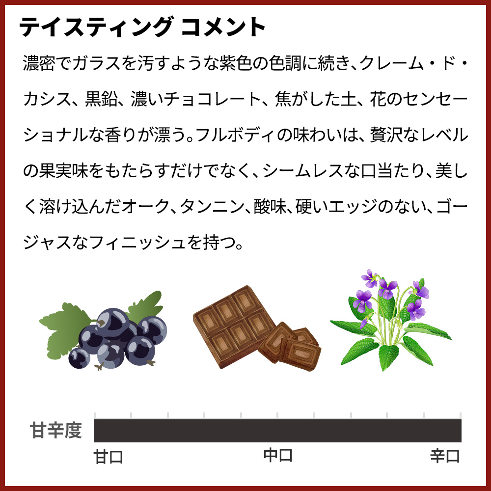 【ブドウの品種】カベルネ・ソーヴィニヨン58%、メルロ34%、カベルネ・フラン4%、プティ・ヴェルド4%