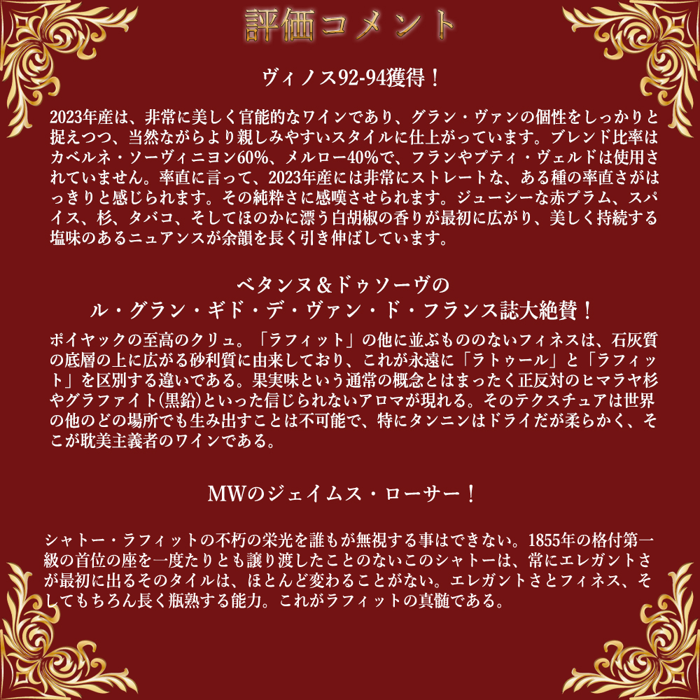【商品説明】最高級メドック格付第一級愛好家垂涎!世界最高峰ワインの一つ!メドック・グラン・クリュ・クラッセ格付第一級の筆頭シャトー!シャトー・ラフィット・ロートシルトの2nd!しかもボルドーのグレイトヴィンテージ[2023]年もののプリムールものがついに入荷! クラスマン誌(現レ・メイユール・ヴァン・ド・フランス誌)をして「世界で無二のエレガントで天性のフィネスを誇るワイン!卓越したアロマは神がかりといえるほどの複雑なタンニンと結びついている」と言わしめ、最高評価3つ星! ロバート・パーカー氏に到っては、最高満点5つ星で、「ボルドーで最も偉大なワイン。フィネスと力強さが見事に融和したワイン」と大絶賛し、1stでパーカーポイント97-99点獲得!なんとこの2ndでさえ堂々の91-93点獲得でコメントは「カベルネ・ソーヴィニヨン60%、メルロー40%のブレンドである2023年産の「カリュアド・ド・ラフィット」は、ミントを思わせるブラックベリー、カシス、シガーボックスの香りが溢れ出る魅力的なワインです。口に含むと、ミディアムからフルボディで、肉厚かつ多層的な味わいが広がり、クリーミーで豊かなテクスチャーを感じさせます。豊かな果実味が、粉を思わせる構造的なタンニンを巧みに包み込み、余韻の長い、響き渡るようなフィニッシュへと続きます。」! さらにジェームス・サックリング驚異の95-96点でコメントは「風味豊かでジューシーなカルーアド。柔らかな口当たりで、熟したベリー、杉、乾燥したタバコのニュアンスが感じられる。1980年代のラフィットを思わせるが、より洗練されている。丸みがあり、美しい味わい。余韻では果実の甘みと長い余韻が際立ち、次第に深みを増していく。最後には鋭く繊細なタンニンが現れる。余韻は非常に長い。カベルネ・ソーヴィニヨン60%、メルロー40%のブレンド。」! デカンタ94点でコメントは「かなり力強く濃厚な香り。ダークフルーツ、ブラックベリー、リコリス、ダークチョコレートが感じられる。後味にはほのかな花の香りが漂う。素晴らしいハリと若々しさがあり、明るく活気に満ち、エネルギーと生き生きとした魅力にあふれている。鋭くストレートな高い酸味がシャープさをもたらすが、同時に弾力もあるため、単調すぎたり硬すぎたりすることはない。重厚なワインとは正反対の印象だ。最初はほとんど酸味が際立つが、その後広がりを見せ、粉っぽいタンニンがフィニッシュに向けて重みを与え、わずかにハーブとスパイスのニュアンスで終わる。クランベリーやイチゴといった力強い赤い果実の香りが鮮やか。エネルギーに満ちつつも抑制され、方向性があり、余韻も長く、すべてがバランスよく調和している。素晴らしいセカンドワインだ。プレス率12%。pH3.7。今年のブレンドにはプティ・ヴェルドは含まれていない。」! ヴィノス92-94点でコメントは「2023年産は、非常に美しく官能的なワインであり、グラン・ヴァンの個性をしっかりと捉えつつ、当然ながらより親しみやすいスタイルに仕上がっています。ブレンド比率はカベルネ・ソーヴィニヨン60%、メルロー40%で、フランやプティ・ヴェルドは使用されていません。率直に言って、2023年産には非常にストレートな、ある種の率直さがはっきりと感じられます。その純粋さに感嘆させられます。ジューシーな赤プラム、スパイス、杉、タバコ、そしてほのかに漂う白胡椒の香りが最初に広がり、美しく持続する塩味のあるニュアンスが余韻を長く引き伸ばしています。」! ベタンヌ&ドゥソーヴのル・グラン・ギド・デ・ヴァン・ド・フランス誌では、「ポイヤックの至高のクリュ。「ラフィット」の他に並ぶもののないフィネスは、石灰質の底層の上に広がる砂利質に由来しており、これが永遠に「ラトゥール」と「ラフィット」を区別する違いである。果実味という通常の概念とはまったく正反対のヒマラヤ杉やグラファイト(黒鉛)といった信じられないアロマが現れる。そのテクスチュアは世界の他のどの場所でも生み出すことは不可能で、特にタンニンはドライだが柔らかく、そこが耽美主義者のワインである。」と大絶賛! MWのジェイムス・ローサーいわく「シャトー・ラフィットの不朽の栄光を誰もが無視する事はできない。1855年の格付第一級の首位の座を一度たりとも譲り渡したことのないこのシャトーは、常にエレガントさが最初に出るそのタイルは、ほとんど変わることがない。エレガントさとフィネス、そしてもちろん長く瓶熟する能力。これがラフィットの真髄である。」 通常5-7年で花開くカリュアドではありますが、長期熟成向きワインに必要とされるすべての特徴を備えたグレイトヴィンテージ!えも言われぬ芳醇と品格を備えたメドック格付第一級のセカンドラベルのプリムールもの!高評価グレイトヴィンテージ[2023]年で、限定少量入荷!