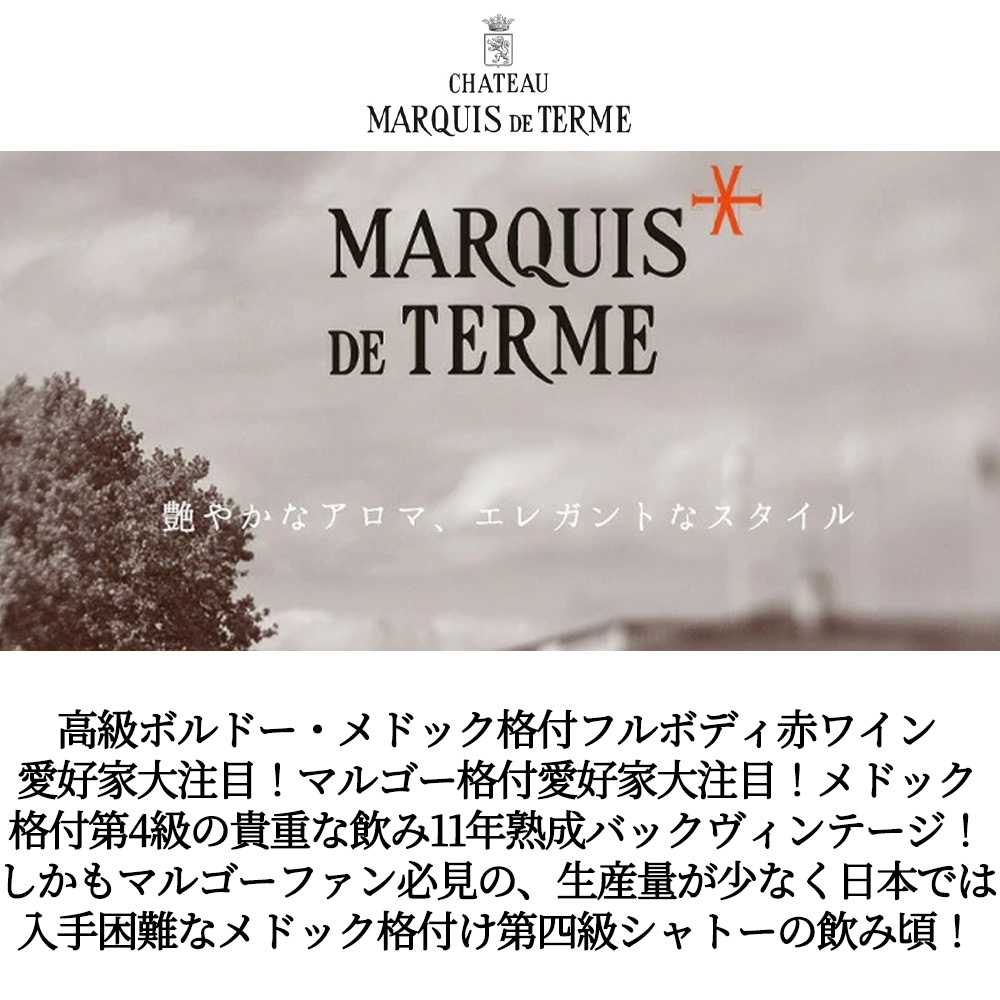 【商品説明】高級ボルドー・メドック格付フルボディ赤ワイン愛好家大注目!マルゴー格付愛好家大注目!メドック格付第4級の貴重な飲み11年熟成バックヴィンテージが極少量入荷!しかもマルゴーファン必見の、生産量が少なく日本では入手困難なメドック格付け四級シャトー。(生産量が比較的少ないのと入手が一部のネゴス(明治屋さん所有のネゴスが中心)に限られていたため、以前まではフランス国内の個人顧客向け中心に販売されるのみで、海外へはほとんど出回っていませんでした。そのため、マルゴー村の綺麗なスタイルの格付けシャトーであるにも関わらず、海外での知名度は決して高くありませでした。) 艶やかなアロマが美しいエレガントなスタイルとして定評!2016年版のエール・フランスのビジネスクラスでも採用の人気マルゴー格付(採用は他のV.T)!1980年代は「1855年に格付されたそのステータスにふさわしい品質を誇る数少ないマルゴーの1つ」と言われ、「格付第一級のシャトー・マルゴーに次ぐ名品と賞賛された絶頂期の1990年には色調の深い、肉厚で、素晴らしいブーケを持つワインが造られた」ようやく2000年V.Tから品質急上昇! 2009年以降(所有者が替わり)の「より芳醇なスタイル」となる以前の優美というよりがっしりしたマルゴーのスタイルとして定評の頃!平均樹齢35年のカベルネ・ソーヴィニヨン60%にメルロ33%、プティ・ヴェルド7%をフレンチオーク樽100%(新樽50%)で長期熟成で造られる、フルボディ辛口赤ワイン! ブラックベリーやプラム、ラズベリーのアロマに、ほのかにナッツやオークのニュアンス!しっかりとしたタンニンとボディの、大人気格付マルゴーフルボディ辛口赤ワインのグレイトヴィンテージ[2014]年が限定極少量入荷! シャトー・マルキ・ド・テルムはメドック格付け四級の実力派シャトー。主にフランス国内の個人向けに販売されるため、日本への輸出量はかなり少なく、稀少性のあるボルドーワインです。新樽比率50%のフレンチオーク樽で18ヵ月間熟成させるため、マルゴーのワインの中では比較的骨格がしっかりしています。 この2014年のシャトー・マルキ・ド・テルムでジェイムスサックリング驚異の93点の高評価!しかも大絶賛コメントは『香りはチョコレートとバニラ、味わいは大胆でドライなタンニン。調和には時間が必要だが、深みがあり、熟成のポテンシャルは高い!2021年まで熟成させる事が必要。93点』と大注目! マルキ・ド・テルムは、色調が濃く肉厚なブーケが特徴。しっかりとしたボディとエレガントさを兼ね備え、長期熟成へのポテンシャルが高い銘柄として、ボルドーファンの人気を集めています。