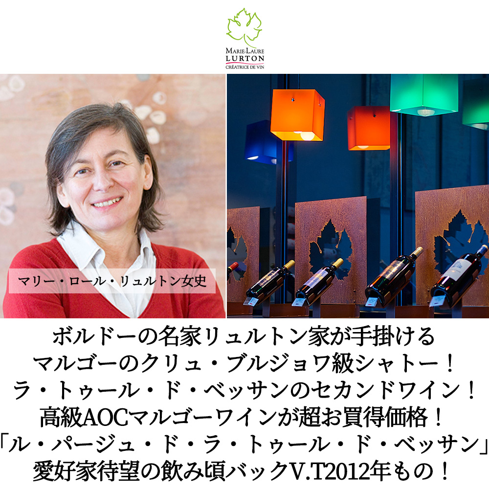 【商品名】ル・パージュ・ド・ラ・トゥール・ド・ベッサン[2012]年・AOCマルゴー(マリー・ラウル・リュルトン家元詰)・シャトー・ラ・トゥール・ド・ベッサンのセカンドワイン・飲み頃14年熟成作品【英名】Le Page de La Tour de Bessan 2012 AOC Margaux (Marie Laure LURTON)