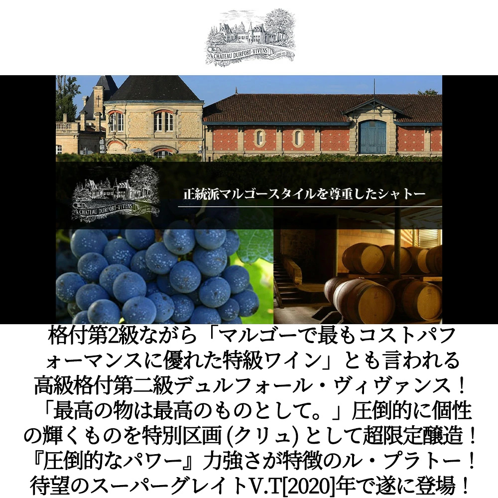 【商品説明】マルゴー格付愛好家大注目!高級ボルドー愛好家大注目!「最高の物は最高のものとして。」圧倒的に個性の輝くものを特別区画(クリュ)として限定醸造!リュルトン家による、比較的小さなメドック格付第二級!シャトー・マルゴー、シャトー・フェリエールなどとともに、カベルネ・ソーヴィニヨンの比率が高く、1995年VT以降、品質向上が著しく、2002年以降はさらに凄いといわれるマルゴー格付!シャトー・デュルフォール・ヴィヴァンス!しかも格付第2級ながら、非常に良心的な価格設定で、「マルゴーで最もコストパフォーマンスに優れた特級ワイン」とも言われるデュルフォール・ヴィヴァンス!そのデュルフォール・ヴィヴァンの個性際立った貴重な特別クリュもの!その名も「ル・プラトー・ド・デュルフォール・ヴィヴァン」!しかもスーパーグレイトヴィンテージ[2020]年が遂に登場!(RVF誌2023年版ではボルドーの赤の2020年に驚異の98点を付ける最高評価スーパーグレイトヴィンテージ!)の[2020]年もので待望入荷! 自然派ビオディナミ(Demeter認証&Ecocert認証)の砂を含む砂利の肥沃な土壌からのカベルネ・ソーヴィニヨン52%にメルロー48%をイタリア製のテラコッタ70%、フレンチオーク樽30%で16ヶ月熟成で造られる究極フルボディ辛口赤ワイン!この“ル・プラトー”は『圧倒的なパワー』!力強さが特徴! 特別に選ばれた区画の葡萄のみを使用した通常のデュルフォール・ヴィヴァンの域を超えた個性が際立ったクリュ(特級区画ワイン)を目指したキュヴェ! 「マルゴーらしいエレガンスと構造の両方を備えた、落ち着きのあるフルボディ赤ワイン。香りはブラックベリーやカシスといった黒系果実の凝縮感が中心にあり、ほどよい熟した果実の甘さが第一印象を形づくります。そこへスミレやドライハーブのニュアンスが重なり、華やかさの中に落ち着いた複雑さが感じられます。口に含むと、しなやかで細かいタンニンがゆっくりと広がり、果実味を支えるように存在します。樽由来のバニラやスパイスは控えめで、テラコッタ熟成による純度の高い果実味とミネラル感が際立つ構成です。余韻には、土や鉱物を思わせるニュアンスが長く続き、フィネスを重んじるシャトーのスタイルがよく表れています。若々しい密度を保ちつつもすでに柔らかさが出ており、今開けても楽しめ、熟成による奥行きの変化も期待できる味わい。」! ヴェルヴェットのテクスチャーときめ細かいタンニンが印象的なパワフルさと貧欲さを演出した傑作マルゴー!特別区画(クリュ)として限定醸造されたル・プラトー・ド・デュルフォール・ヴィヴァンのスーパーグレイトヴィンテージ[2020]年ものが限定で遂に登場!