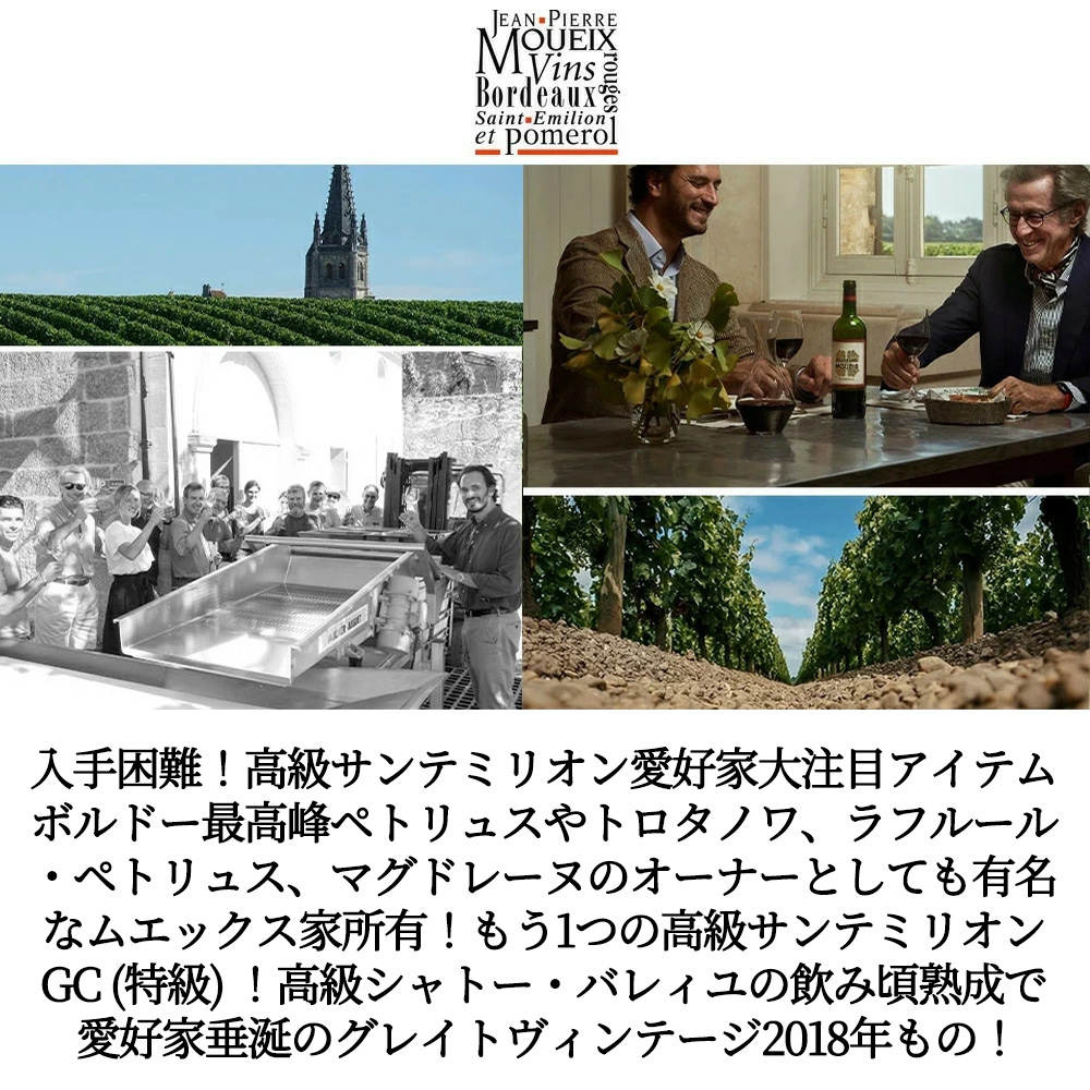 【商品説明】入手困難!ボルドー・サンテミリオン・グラン・クリュ (特級) 辛口フルボディ赤ワイン愛好家大注目!しかもワインアドヴォケイト誌でもサンテミリオンに驚異の94点を付けるグレイトヴィンテージ[2018]年もの! ボルドー最高峰であり、世界的に有名なシャトー ペトリュス愛好家大注目!トロタノワやペトリュス、ラフルール・ペトリュス、マグドレーヌのオーナーでもあるムエックス家所有による、もうひとつのサンテミリオン特級!グラン・クリュ!このシャトー・バレィユは、サンテミリオン南西のドルドーニュ川にほど近い、サン・シュルピス・ド・ファレランス村にあり、150年前から現在までムエックス家で所有! 畑は3haで、サンテミリオン特有の砂利の多い土壌にあります!平均樹齢25年のメルロー70%にカベルネ・フラン30%を、収穫は50%が手摘みで行われ、60%がオーク樽 (新樽50%で残りは1年使用樽) 熟成!残り40%がステンレスタンクで熟成!しかもエチケットも、同じムエックス家所有のトロタノワを思わせるラベル! 某評論家の2018年へのコメントは「メルロー70%、カベルネ・フラン30%のブレンドワイン。サンテミリオンで30年以上栽培されているブドウ畑で収穫され、フランス産オーク樽(50%が新樽)で12ヶ月間熟成されています。魅惑的な香りと率直な味わいで、花、ハーブ、甘いスパイスのノートが、ちょうど良い熟度に熟した赤と黒の果実を包み込み、爽やかな酸味と、引き締まったきめ細やかなタンニンがそれを支えています。力強く構造的でありながら、正確で滑らか、洗練された味わいで、土の香り、ブラックベリー、プラム、甘草、スミレ、タバコを思わせる余韻が長く続きます。」! この2018年ものの1stは、ブラックベリーやプラムの果実味に富み、焙煎コーヒーの香ばしい風味が魅力的で、上質のサンテミリオンのメルロー品種の特徴が豊か!口当たり滑らかでありながら、凝縮感のあるコクが感じられる、さすがペトリュスのムエックス家と感じさせる、究極辛口フルボディ赤ワイン!が大人気飲み頃8年熟成でグレイトヴィンテージ[2018]年もので限定で極少量入荷!