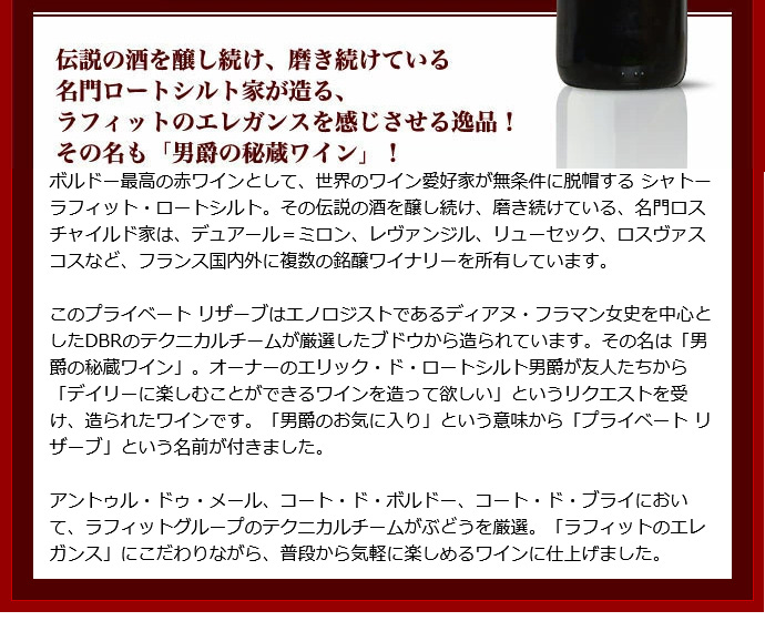 ![]() ボルドー最高の赤ワインとして、世界のワイン愛好家が無条件に脱帽する シャトー ラフィット・ロートシルト。その伝説の酒を醸し続け、磨き続けている、名門ロスチャイルド家は、デュアール=ミロン、レヴァンジル、リューセック、ロスヴァスコスなど、フランス国内外に複数の銘醸ワイナリーを所有しています。 ![]() このプライベート リザーブはエノロジストであるディアヌ・フラマン女史を中心としたDBRのテクニカルチームが厳選したブドウから造られています。その名は「男爵の秘蔵ワイン」。オーナーのエリック・ド・ロートシルト男爵が友人たちから「デイリーに楽しむことができるワインを造って欲しい」というリクエストを受け、造られたワインです。「男爵のお気に入り」という意味から「プライベート リザーブ」という名前が付きました。 |