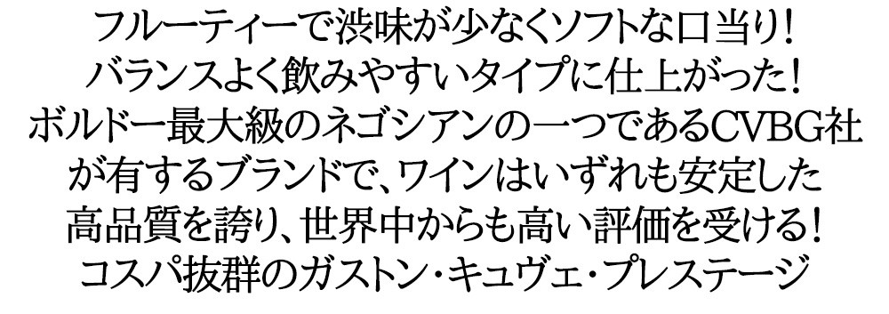 ![]() ガストン・シャルパンティエはボルドー最大級のネゴシアンの一つであるCVBG社が有するブランドで、ワインはいずれも安定した高品質を誇り、世界中から高い評価を受けています。CVBG社のチーフ・ワインメーカーを務めるトマ・ドゥルイノー氏は、2006年にマスター・オブ・ワインの称号を持つイギリスのワイン評論家ティム・アトキン氏により、マルセロ・パパ氏(コンチャ・イ・トロ)やミゲル・トーレス氏(トーレス)らと共に世界のトップ6の醸造家に選ばれています。 ![]() CVBG社の歴史は古く、1840年に同社の母体が設立!その後、多くのネゴシアンや生産者を吸収し、今日ではボトルワインの出荷量としてはボルドー最大の規模となるとともに、メドックやグラーヴ等に265ha以上の畑を所有し、5つのシャトーを自ら経営するボルドーの大御所。 |