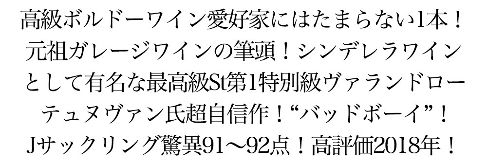 バッド ボーイ 2018年 ジャン リュック テュヌヴァン ■葡萄品種:メルロー100% あのシャトー・ヴァランドローのジャン・リュック・テュヌヴァン氏がリリース!その名も(パーカー氏命名の)“バッドボーイ(やんちゃ者)”!ボルドーワイン愛好家にはたまらない1本です!しかも樹齢40年のメルロー100%をバリック12~14ヶ月熟成で造られる、まさにサンテミリオンを彷彿とさせるテュヌヴァン氏らしい構成!の究極フルボディ赤ワイン! ボルドー高級サンテミリオン!元祖ガレージワインの筆頭! 元祖シンデレラワインとして知られ、2012年新格付け発表で、グラン・クリュからいきなり2階級昇格して、プルミエ・グラン・クリュ・クラッセ(第一特別級格付)に昇格!(これによりサンテミリオン最高峰のプルミエ・グラン・クリュ・クラッセは、シェヴァル・ブランやオーゾンヌを含め、18シャトーに!)各ワイン誌絶賛!