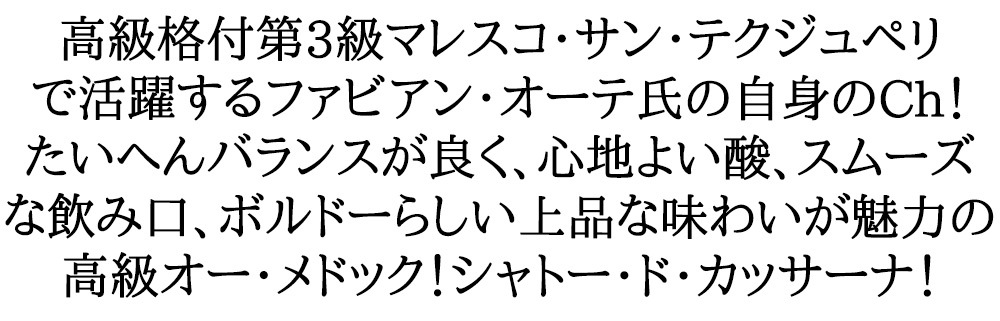 ![]() シャトー・ド・カッサーナ[2018]年 ぶどう品種:カベルネ・ソーヴィニヨン52%/メルロ34%/ カベルネ・フラン6%/プティ・ヴェルド6%/カルムネール2% オーナーのファビアン・オーテは2004年にわずか1.6haの畑を購入しました!彼は複数のワイナリーで働き、自身のワイン造りのプロジェクトのために資金をためました!現在はAOCメドック3級のシャトー・マレスコ・サン・テクジュペリで、彼は畑の管理を担当しています!栽培品種はカベルネ・ソーヴィニヨン、メルロ、プティ・ヴェルド、カルムネールの5種類で、1ヘクタール当たり10,000本の密植、平均樹齢は40年です! 認証は取得していませんが、ビオディナミの原則に従い有機材倍を行っています!フランス農水省が認めるHVE(Haute Valeur Environnmentale)のレベル3を取得しています!収穫は100%手摘みで行います!発酵はステンレスタンクで3週間行い、その後フレンチオーク樽に移し、最低12ヶ月以上熟成させます!全体の30%に新樽を使用しています!たいへんバランスが良く、スムーズな飲み口、ボルドーらしい上品な味わいです!心地よい酸が感じられます! |