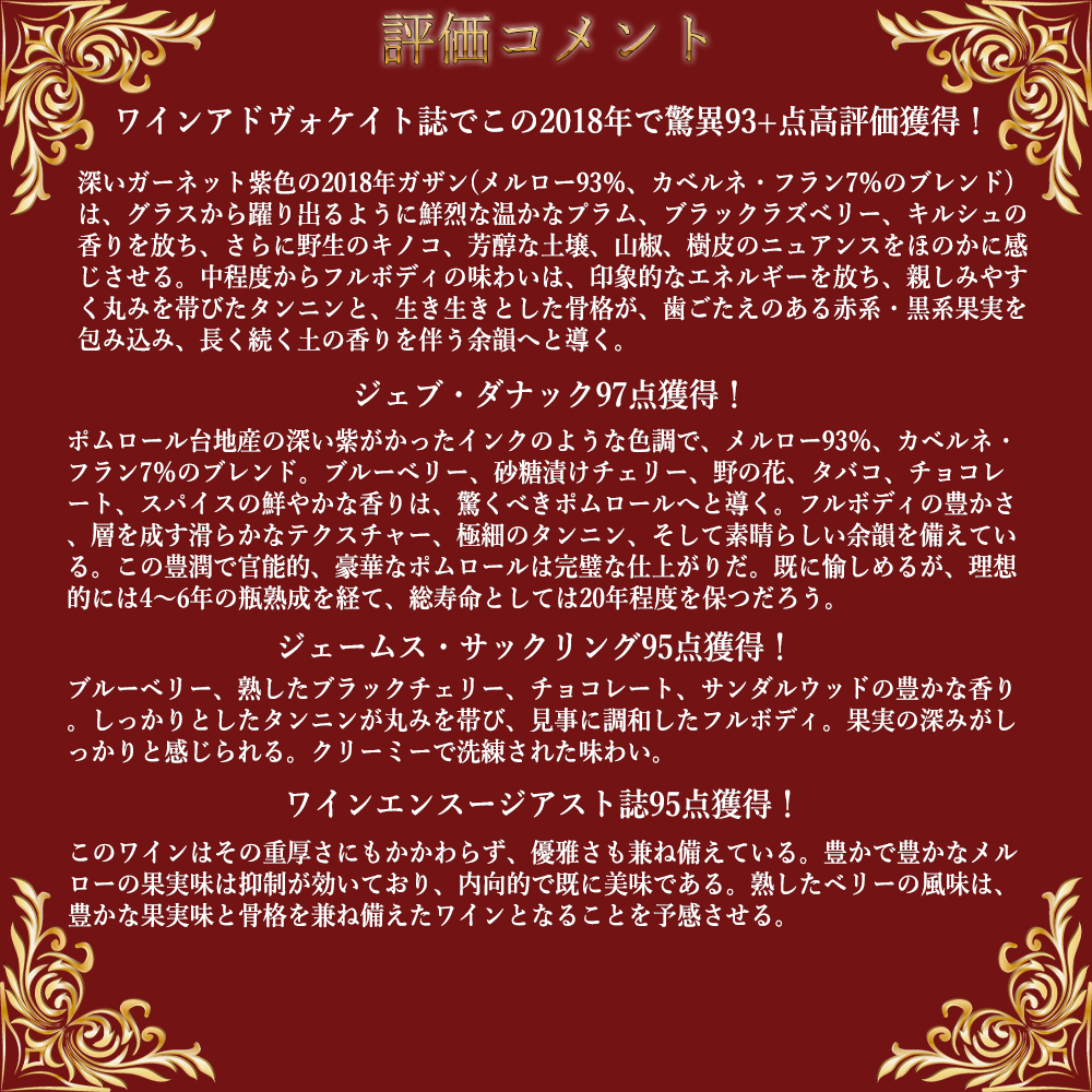【商品名】シャトー・ガザン[2018]年・AOCポムロール・ジェブ・ダナック97点&ジェームス・サックリング95点&ワインエンスージアスト誌95点&デカンタ94点・赤ワイン・フルボディ・750ml