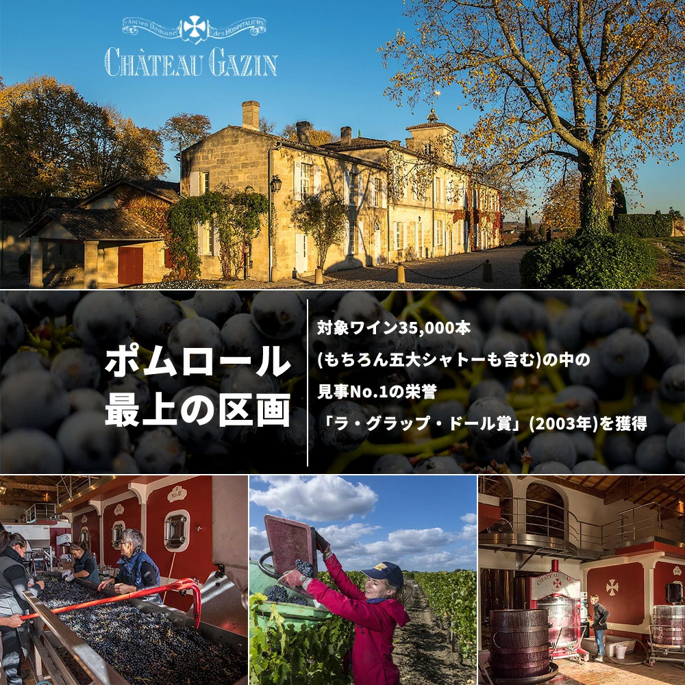 【商品説明】入手困難!高級ボルドー・ポムロールフルボディ辛口赤ワイン愛好家大注目!愛好家待望の高評価ヴィンテージ[2018]年(ワインアドヴォケイト誌がポムロールに驚異の94点を付けるスーパーグレイトヴィンテージ)で遂に少量入荷!畏敬の念さえ覚える偉大な高級赤ワインの村!ポムロール!あの偉大なシャトー・ペトリュスの隣であり、ラフィット・ロートシルトと同経営のシャトー・レヴァンジルの隣!ポムロール最上の区画!特にペトリュスと同じ「純粋な重粘土の畑」を持っているのはポムロールではこのガザンが唯一のシャトー!老舗シャトーの見事な復活!眠れる巨人ついに目ざめる。 このワインでロバート・パーカー氏は★★★★4つ星生産者に挙げ、なんとワインアドヴォケイト誌でこの2018年で驚異93+点高評価でコメントは『深いガーネット紫色の2018年ガザン(メルロー93%、カベルネ・フラン7%のブレンド)は、グラスから躍り出るように鮮烈な温かなプラム、ブラックラズベリー、キルシュの香りを放ち、さらに野生のキノコ、芳醇な土壌、山椒、樹皮のニュアンスをほのかに感じさせる。中程度からフルボディの味わいは、印象的なエネルギーを放ち、親しみやすく丸みを帯びたタンニンと、生き生きとした骨格が、歯ごたえのある赤系・黒系果実を包み込み、長く続く土の香りを伴う余韻へと導く。』と大注目! 各誌の評価もすさまじく、ジェブ・ダナック97点でコメントは「2018年シャトー・ガザンは、ポムロール台地産の深い紫がかったインクのような色調で、メルロー93%、カベルネ・フラン7%のブレンド。ブルーベリー、砂糖漬けチェリー、野の花、タバコ、チョコレート、スパイスの鮮やかな香りは、驚くべきポムロールへと導く。フルボディの豊かさ、層を成す滑らかなテクスチャー、極細のタンニン、そして素晴らしい余韻を備えている。この豊潤で官能的、豪華なポムロールは完璧な仕上がりだ。既に愉しめるが、理想的には4~6年の瓶熟成を経て、総寿命としては20年程度を保つだろう。」! さらにジェームス・サックリング95点でコメントは「ブルーベリー、熟したブラックチェリー、チョコレート、サンダルウッドの豊かな香り。しっかりとしたタンニンが丸みを帯び、見事に調和したフルボディ。果実の深みがしっかりと感じられる。クリーミーで洗練された味わい。」! ワインエンスージアスト誌95点でコメントは「このワインはその重厚さにもかかわらず、優雅さも兼ね備えている。豊かで豊かなメルローの果実味は抑制が効いており、内向的で既に美味である。熟したベリーの風味は、豊かな果実味と骨格を兼ね備えたワインとなることを予感させる。」! ベタンヌ&ドゥソーヴやゴーミヨ誌、R.V.F誌なども軒並み高評価!ちなみにアシェット・ガイド誌のグレートワインテイスティングで対象ワイン35,000本(もちろん五大シャトーも含む)の中の見事No.1の栄誉「ラ・グラップ・ドール賞」(2003年)を獲得しています。この大人気2018年はメルロー種93%にカベルネ・フラン7%をフレンチオーク樽100%にて驚異の18ヶ月熟成で造られる究極フルボディ辛口赤ワイン! シャトーの2018年のコメントは、「2018年は私達ファミリーの手で造られた100番目のヴィンテージ。2018年は過去30年間に生産したヴィンテージの中で間違いなく最高レベルのワインのひとつです。このワインの特徴として繊細さの点で、非常に評価の高い2016年ヴィンテージに勝ると考えております。爽やかでありながら、複雑で甘味な構造と相まって口の中に長く留まる余韻をお楽しみいただけることでしょう。」と絶賛コメント! ミルクチョコや熟したベリーのアロマ!黒系果実味と豊満な味わい!繊細なタンニンとのバランスが素晴らしい高級ポムロール!ドゥ・バイアンクール・ディ・クール家の手による現在!絶好調のシャトー・ガザン高評価連発で非常に入手困難なグレイトヴィンテージ[2018]年で限定で少量入荷!