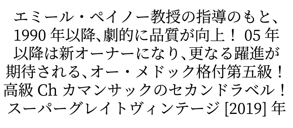 ![]() ラ クロズリー ド カマンサック 2019 AOCオー メドック グラン クリュ クラッセ 格付第五級 セカンド ラベル 赤 辛口 750ml ボルドー メドック格付フルボディ辛口赤ワイン愛好家大注目!メドック・グラン・クリュ・クラッセ格付第5級のシャトー・カマンサックの2ndラベル!しかもスーパーグレイトヴィンテージ2019年もの(2019年は、ボルドー全域で素晴らしい天候に恵まれた歴史的グレイトヴィンテージで、アシェット・ガイド誌2022年版でもボルドーの赤に18/20点で、ワインアドヴォケイト誌でもマルゴーやサンジュリアン、ポイヤック、サンテステフ等に驚異の96点を付ける偉大ヴィンテージ)が遂に入荷!しかも大人気格付第二級のシャトー・グリュオー・ラローズや、人気シャトー・シャス・スプリーンも所有する、名門メルロ一家の手による人気格付!評論家のヒュー・ジョンソン氏に「必ずしもクラシックとはいえないまでも、とても生き生きとしたワイン。新しい所有者(2005年から)は、シャス・スプリーンを所有する一族で、期待できる。セカンド・ラベルにラ・クロズリー・ド・カマンサック」と★★Wスターで大注目!アシェット・ガイド誌大注目!格付シャトーを所有する新オーナーになって、評価も品質も急上昇!洗練されたベリーやカシスの魅力的な香り!柔らかい果実味と滑らかでうまく溶け込んだタンニンにかすかにオークのニュアンスの品格のある味わいの究極メドック格付のセカンドラベルがスーパーグレイトヴィンテージ[2019]年もので限定少量入荷! |