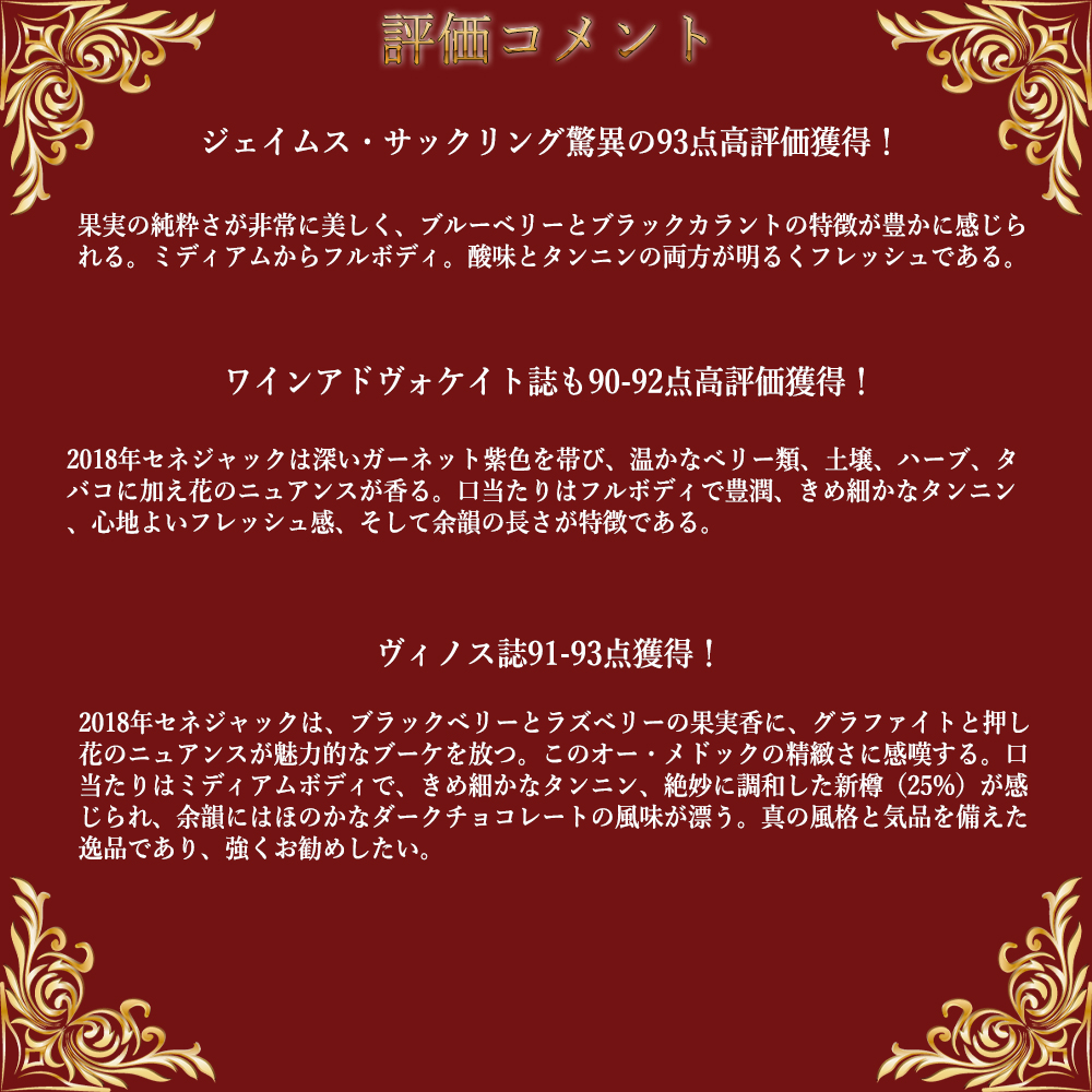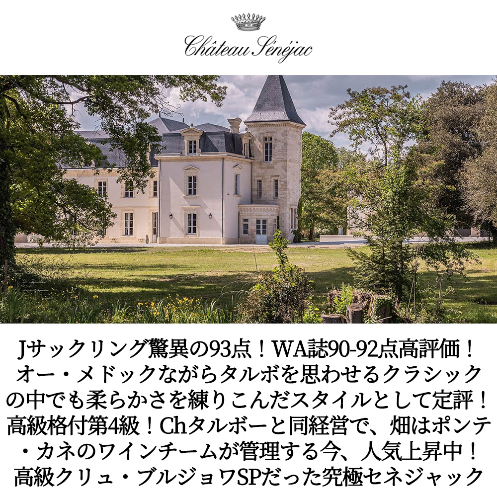【商品説明】ボルドー・オー・メドック・クリュ・ブルジョワ・フルボディ辛口赤ワイン愛好家大注目!しかも超グレイトヴィンテージ[2018]年もの!(2018年は、ワインアドヴォケイト誌のヴィンテージチャートにてサンジュリアン、ポイヤック、サンテステフ、マルゴーに96点を付ける素晴らしいヴィンテージ)! 造り手は、大人気サンジュリアンの格付シャトー(メドック格付第4級)!シャトー・タルボーと同経営!(1999年より)タルボーの所有者の一族が所有!オー・メドックながらタルボを思わせるクラシックの中でも柔らかさを練りこんだスタイルで定評!人気も品質も急上昇中のシャトー・セネジャックの超グレイトヴィンテージ[2018]年もの! なんと!この2018年でジェイムス・サックリング驚異の93点高評価でコメントは『果実の純粋さが非常に美しく、ブルーベリーとブラックカラントの特徴が豊かに感じられる。ミディアムからフルボディ。酸味とタンニンの両方が明るくフレッシュである。』! ワインアドヴォケイト誌も90-92点高評価でコメントは『2018年セネジャックは深いガーネット紫色を帯び、温かなベリー類、土壌、ハーブ、タバコに加え花のニュアンスが香る。口当たりはフルボディで豊潤、きめ細かなタンニン、心地よいフレッシュ感、そして余韻の長さが特徴である。』! ヴィノス誌91-93点でコメントは『2018年セネジャックは、ブラックベリーとラズベリーの果実香に、グラファイトと押し花のニュアンスが魅力的なブーケを放つ。このオー・メドックの精緻さに感嘆する。口当たりはミディアムボディで、きめ細かなタンニン、絶妙に調和した新樽(25%)が感じられ、余韻にはほのかなダークチョコレートの風味が漂う。真の風格と気品を備えた逸品であり、強くお勧めしたい。』! 柔らかく果実味豊かなため早くからも楽しめるこのワイン!レストラン様でも採用も多数!シャトー・ポンテ・カネのワインチームとオーナーのアルフレッド・テスロンも畑の管理に参加!さらに人気上昇中! ブラックベリーやインディアン・スパイスにタバコの葉、ローストしたハーブに、ローストしたモカ・コーヒーのアロマ!に熟したまろやかなタンニンのフルボディ辛口赤ワインが高評価グレイトヴィンテージ[2018]年で極少量入荷!